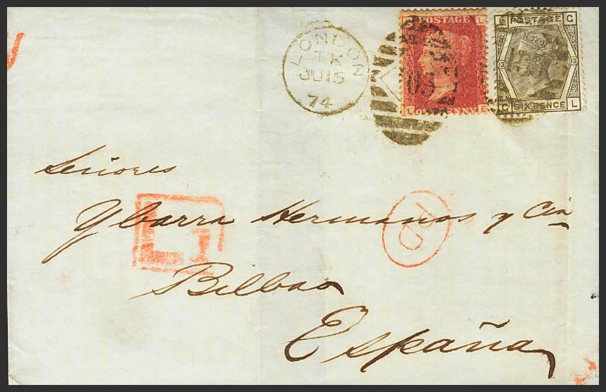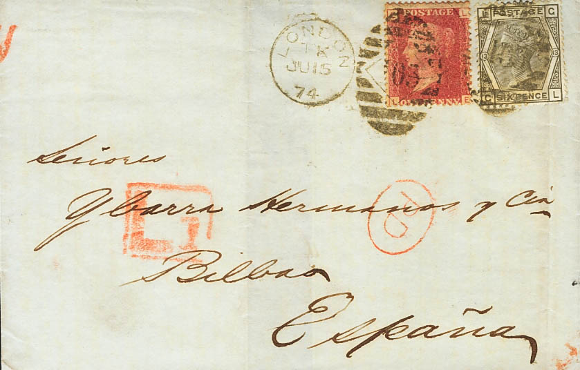 Yvert 26, 52. 1874. 1 p carmÃn, Plancha 170 y 6 p gris oliva, Plancha 13. LONDRES a BILBAO. MAGNIFICA.