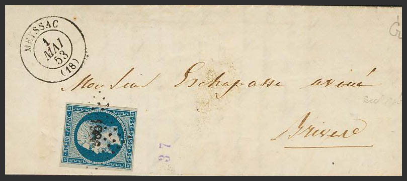 Yvert 10. 1853. 25 cts azul. MEYSSAC a BRIVES. Matasello ROMBO DE CIFRAS PEQUEÑAS "1986". MAGNIFICA.