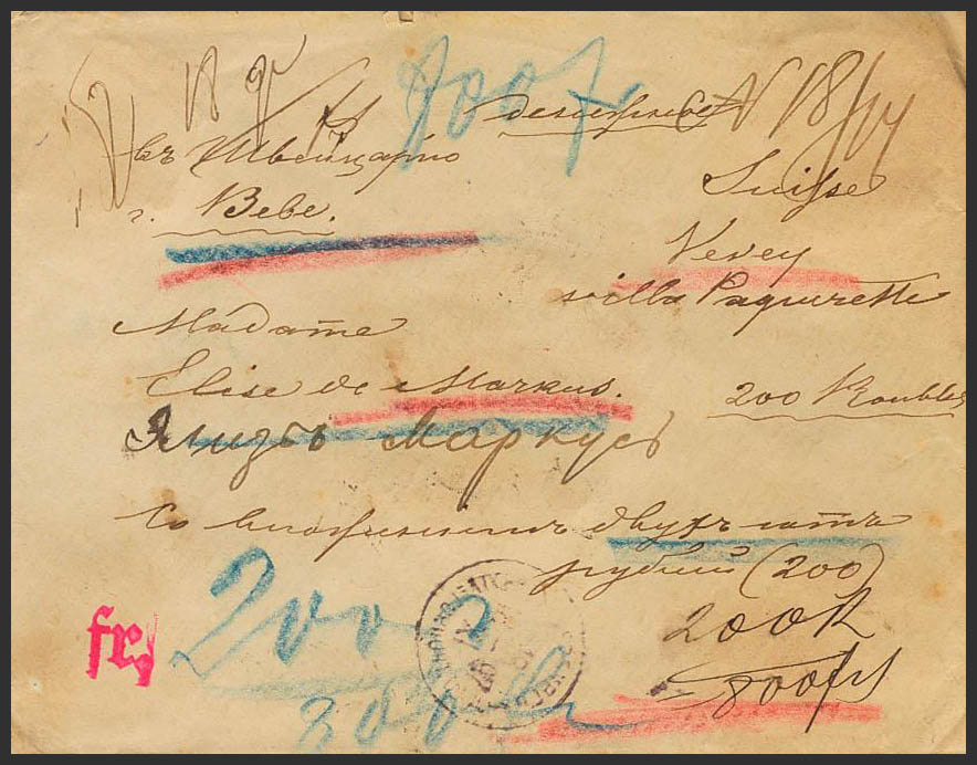 1897. Valor Declarado dirigido a VEVEY (SUIZA). En el frente diversas anotaciones y cifras manuscritas, al dorso tránsitos y llegada. MAGNIFICA.