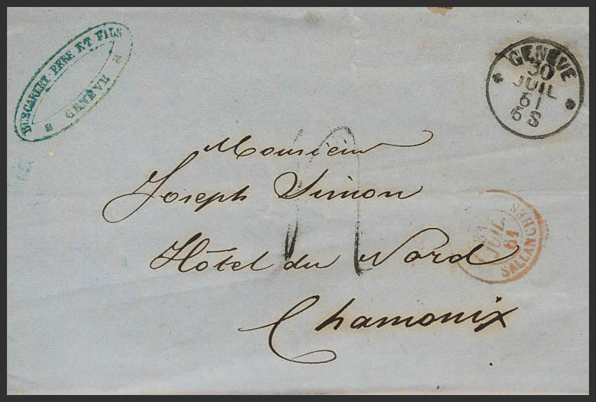 1861. GINEBRA a CHAMONIX. Fechador GENEVE y SUISSE / SALLANCHES, de entrada en Suiza, en rojo. MAGNIFICA.