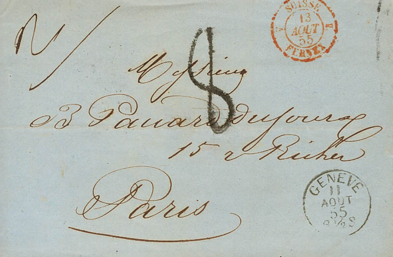 1855. GINEBRA a PARIS. Fechador GENEVE y SUISSE / 4 FERNEX 4, de entrada en rojo. MAGNIFICA.