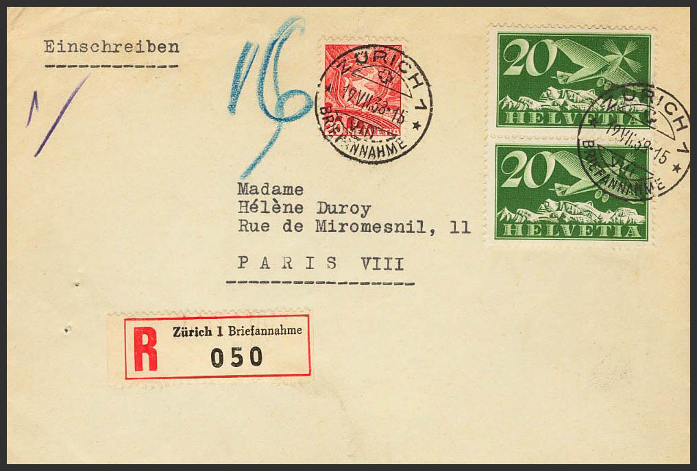Yvert 4(2). 1938. 20 cts verde, dos sellos y 20 cts rojo. Certificado de ZURICH a PARIS. MAGNIFICA.