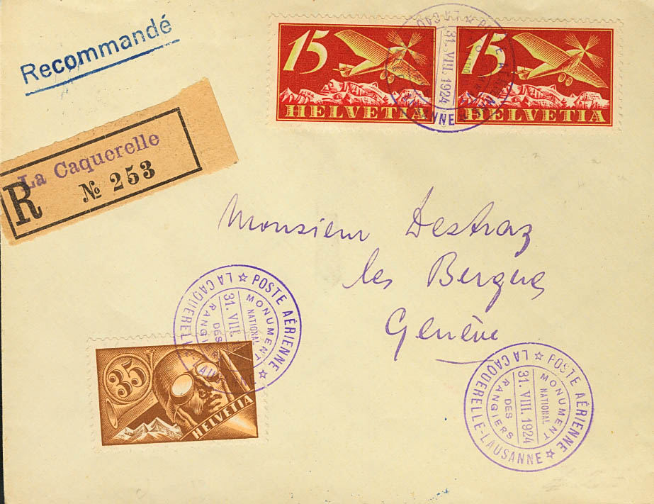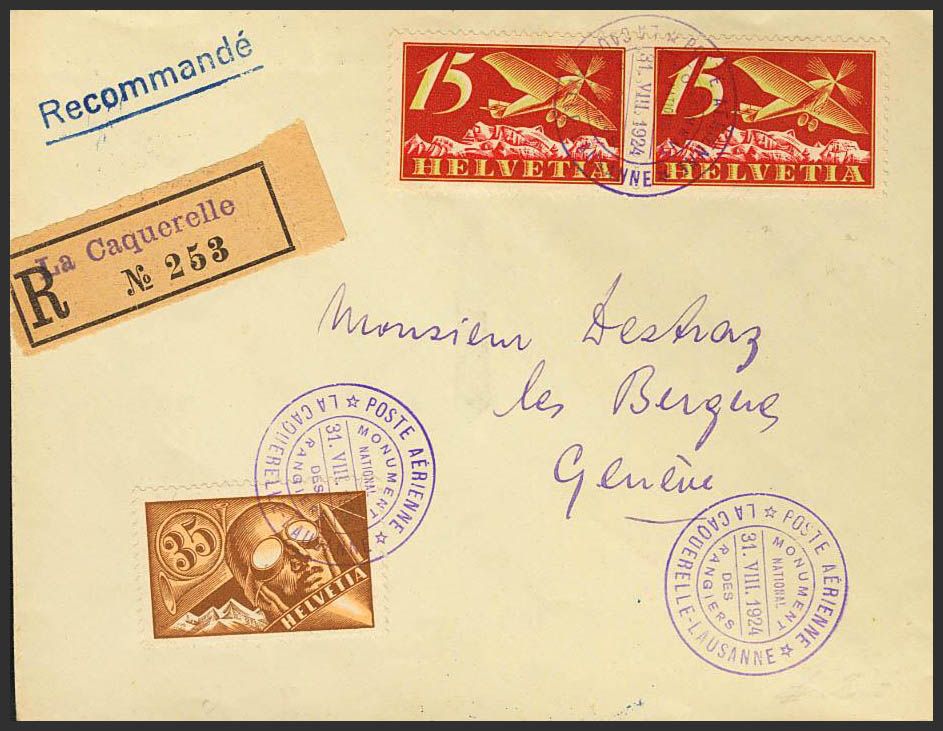 Yvert 3(2), 6. 1924. 15 cts, dos sellos y 35 cts. Certificado de LA CAQUERELLE a GINEBRA. Matasello POSTE AERIENNE / LA CAQUERELLE-LAUSANE, en violeta y al dorso llegada. MAGNIFICA.