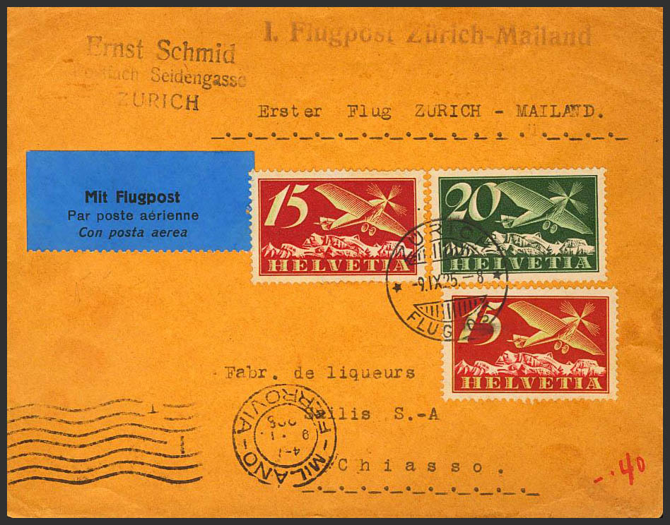 Yvert 3(2), 4. 1925. 15 cts rojo, dos sellos y 20 cts verde. Correo Aéreo de ZURICH a CHIASSO. Al dorso tránsito. MAGNIFICA.
