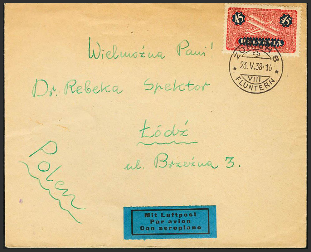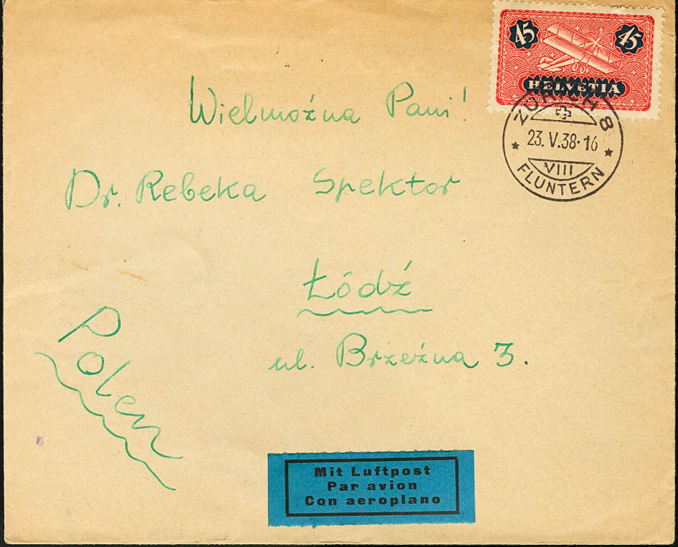 Yvert 8. 1938. 45 cts rojo y azul. Correo Aéreo de ZURICH a LODZ (POLONIA). Al dorso llegada. MAGNIFICA.