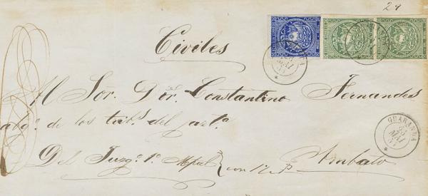 Yvert 22(2). 1869. 10 ctvos verde, pareja. Dirigida a SANTIAGO DE CEIBA (CUBA). En el frente marca NA, en azul de la empresa de Correos MarÃtimos de La Habana aplicada en tránsito para indicar el origen. BONITA Y RARA.