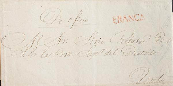1855. Plica Judicial de AMBATO a QUITO. Marca FRANCA, en rojo. MAGNIFICA Y RARA.