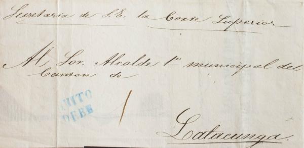 1854. Plica Judicial de QUITO a LATACUNGA. Marca QUITO / DEBE, en azul. MAGNIFICA.