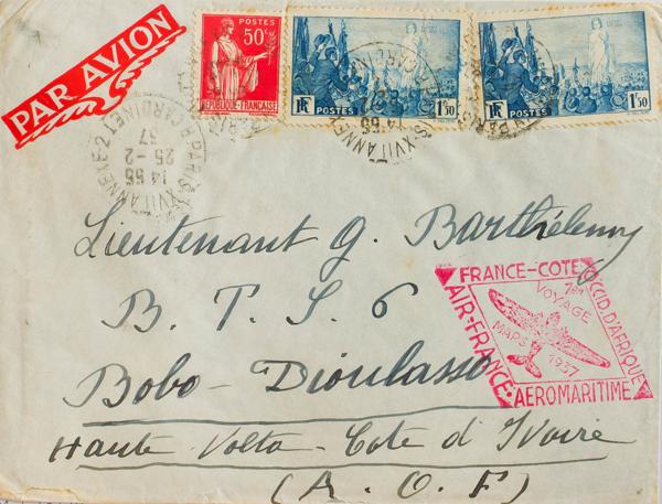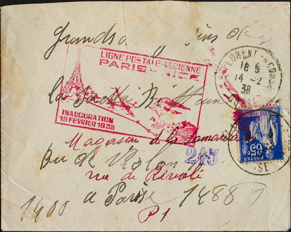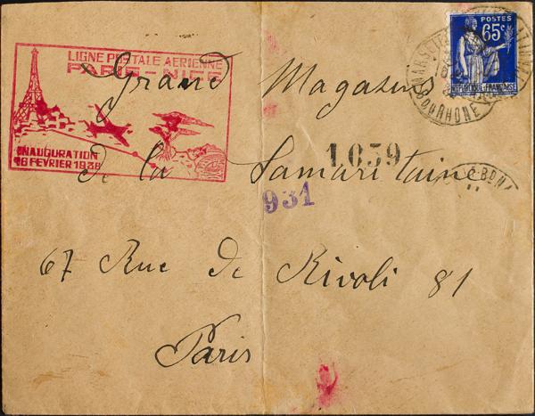 Yvert 445. 1939. 90 cts castaño. SAIN PIERRE DU VAVVRAY (FRANCIA) a ESTAQUE. En el frente marca 1º LIAISON AEROPOSTALE / DE NUIT / PARIS / MARSEILLE, al dorso llegada. MAGNIFICA.