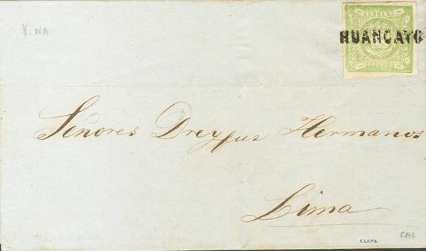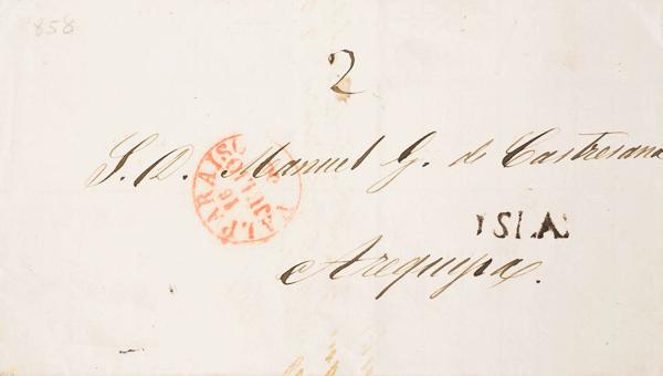 Yvert 11. 1857. 25 reis azul (márgenes justos). FUNCHAL a BILBAO. Matasello Parrilla numeral "51", en el frente marca oval MADEIRA y porteo español "2 Rs" (reales) al estar incorrectamente franqueada. BONITA Y RARA.