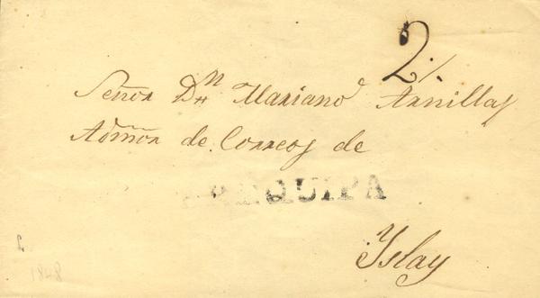 1846. CADIZ a OPORTO. Marca de la Agencia Consular Británica B. C. / CADIZ, en tránsito por Lisboa se aplica la marca P. BRITO, en azul (LSBPB1). MAGNIFICA Y RARA.