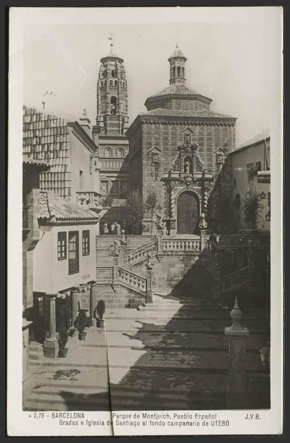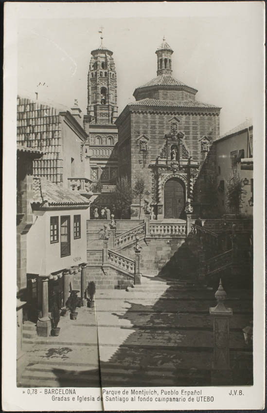 BARCELONA. Parque de Montjuich. Gradas e Iglesia de Santiago (postal rajada).