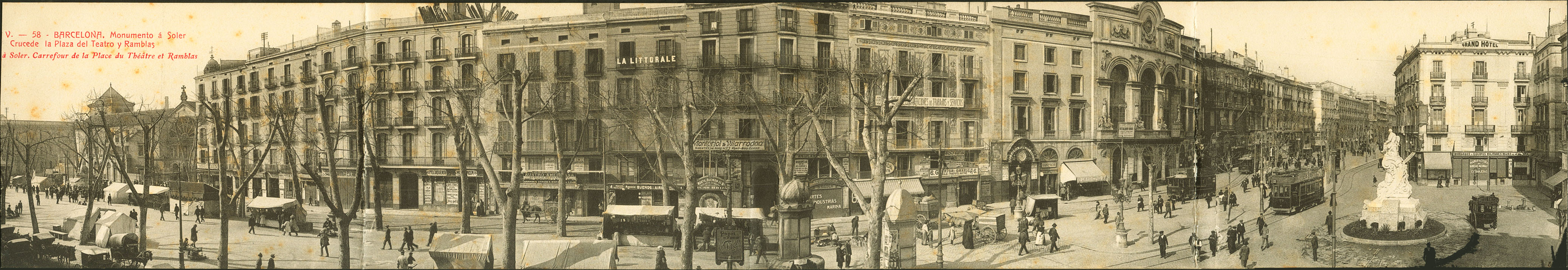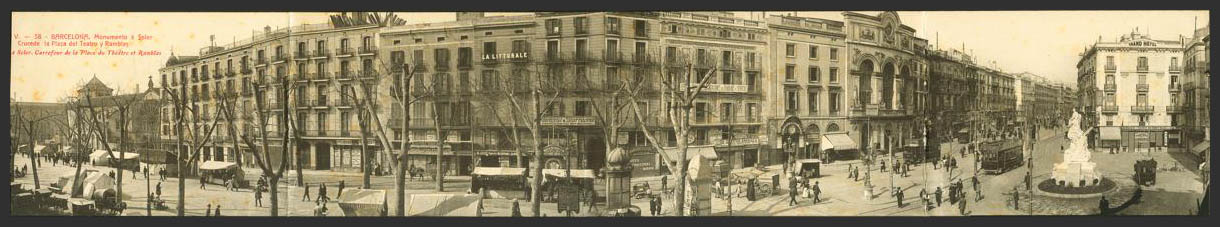 BARCELONA. Monumento a Soler. Cruce de la Plaza del Teatro y Ramblas. Postal cuadruple.