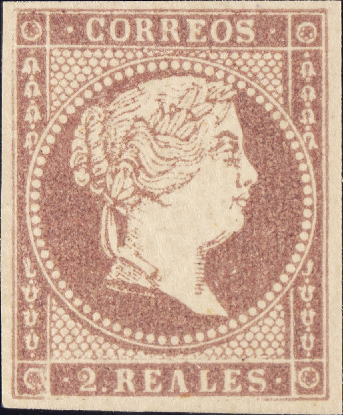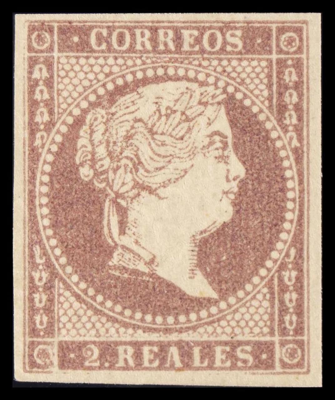 ★★ 50. 1855. 2 reales castaño violeta. MAGNIFICO. Edifil 2020: +90 Euros