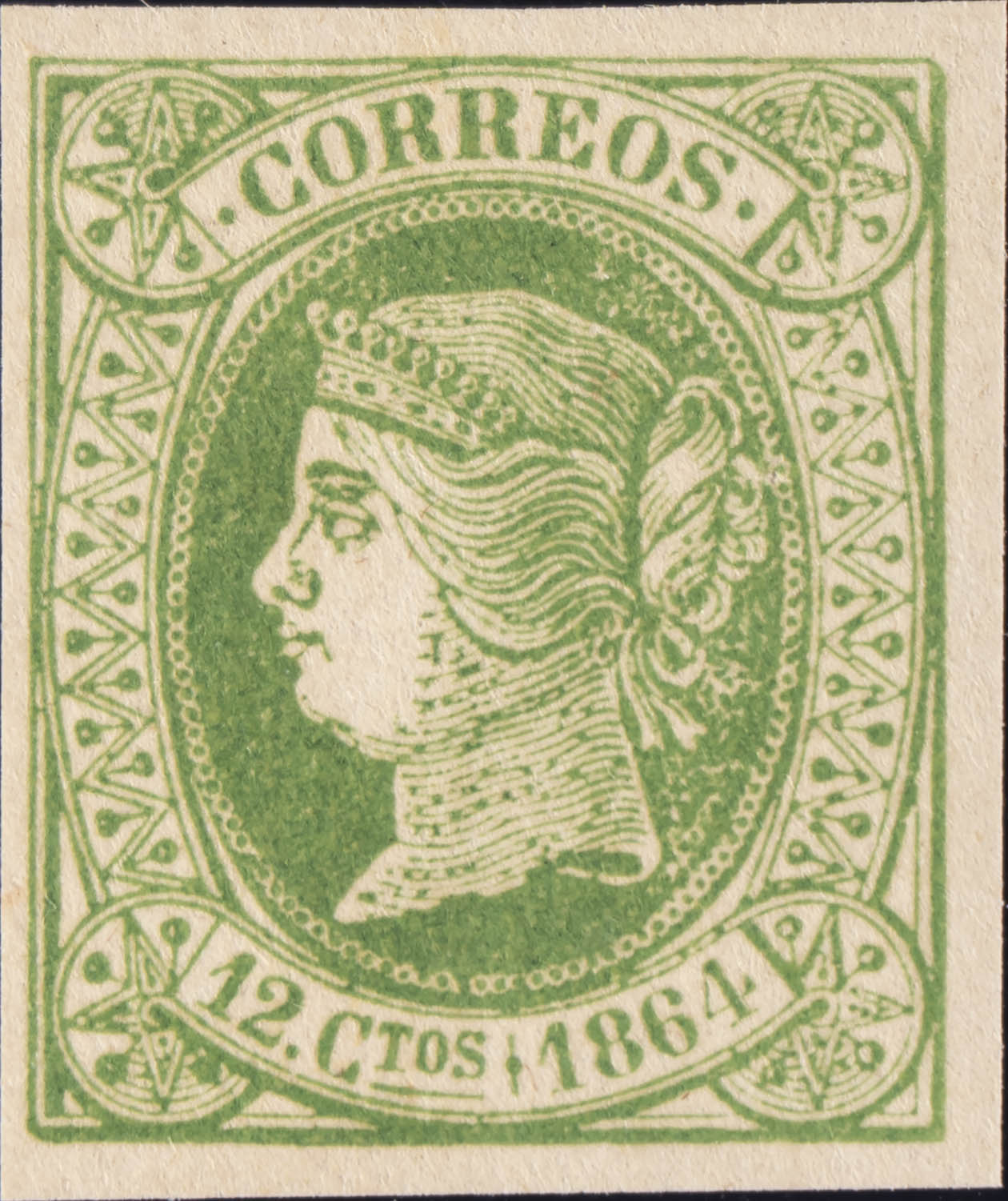 ★ 65. 1864. 12 cuartos verde. MAGNIFICO. Edifil 2020: 60 Euros