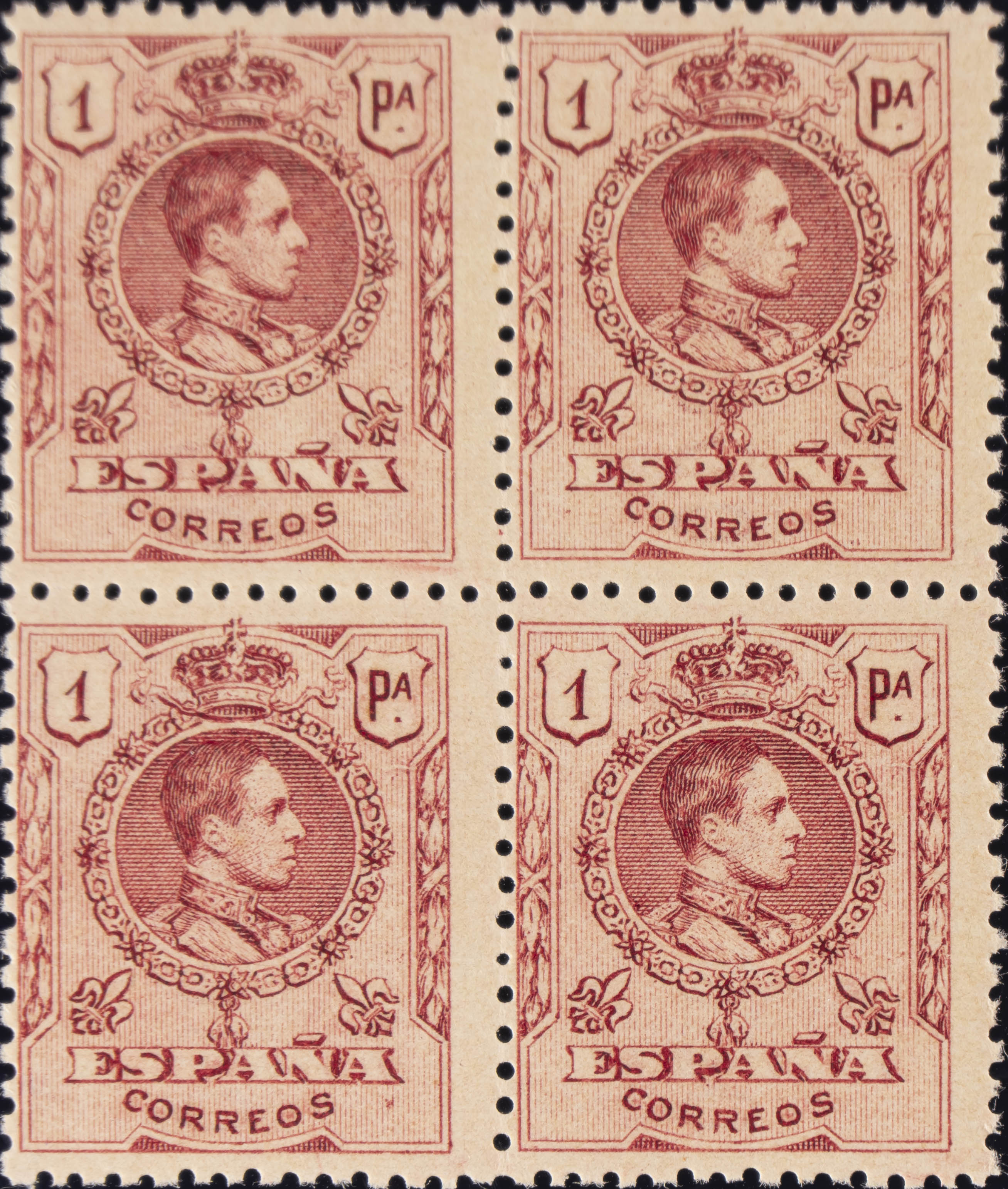 ★★ 278N(4). 1909. 1 pts carmÃn, bloque de cuatro. NºA000.000. MAGNIFICO. Edifil 2015: +528 Euros