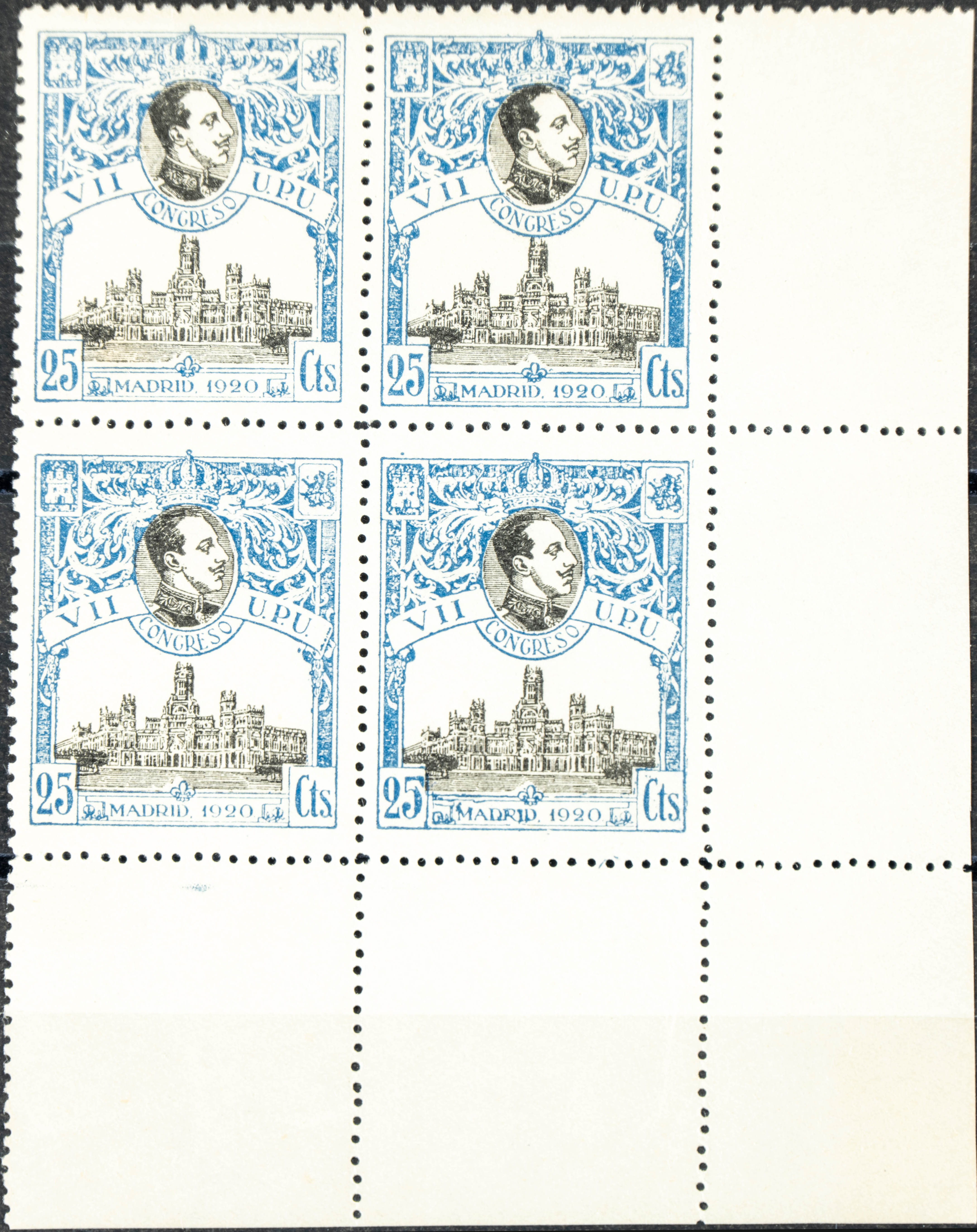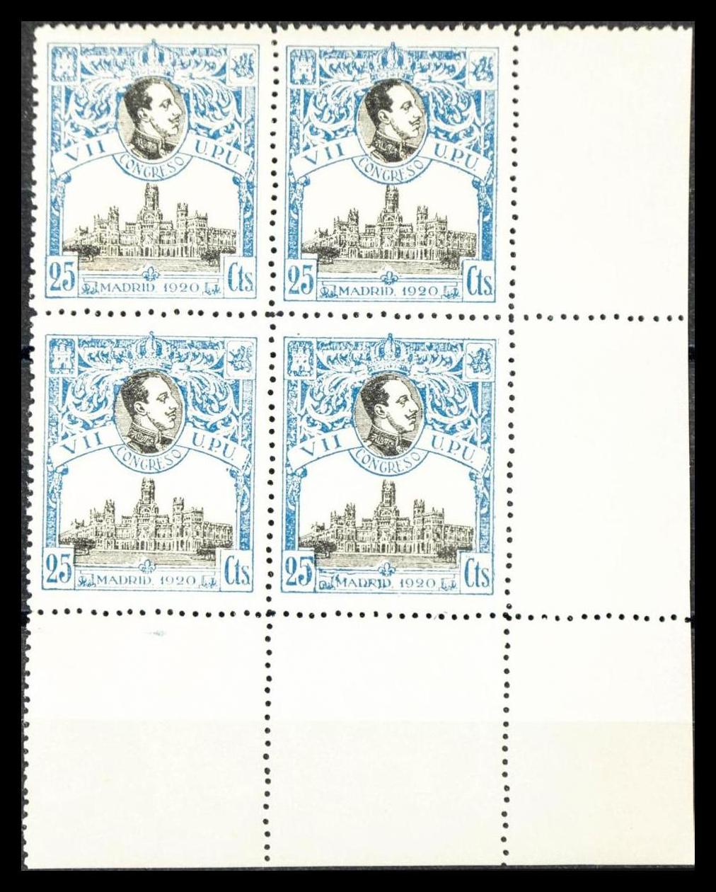 ★★ 303(4). 1920. 25 cts azul, bloque de cuatro, esquina de pliego. Excelente centraje. MAGNIFICO.