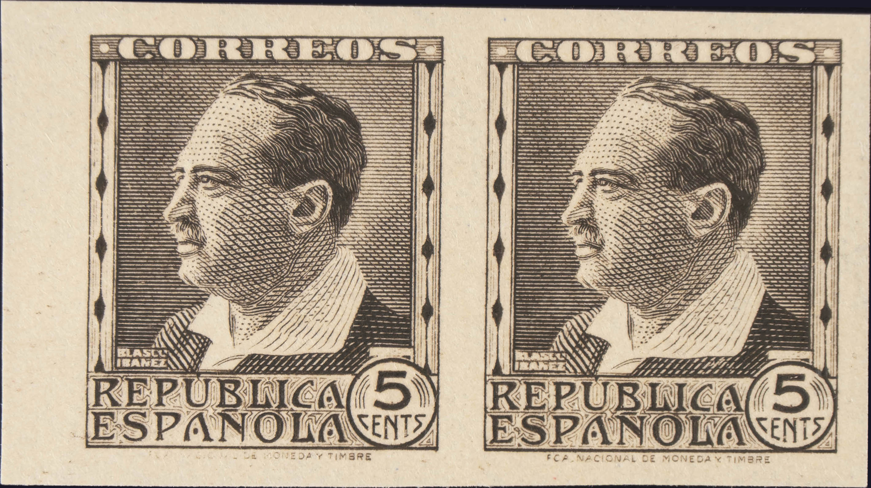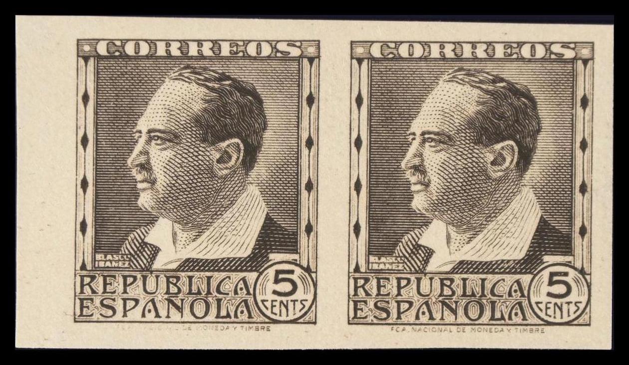★★ 681s(2). 1934. 5 cts castaño negro, pareja. SIN DENTAR. MAGNIFICA. Edifil 2020: +10,4 Euros