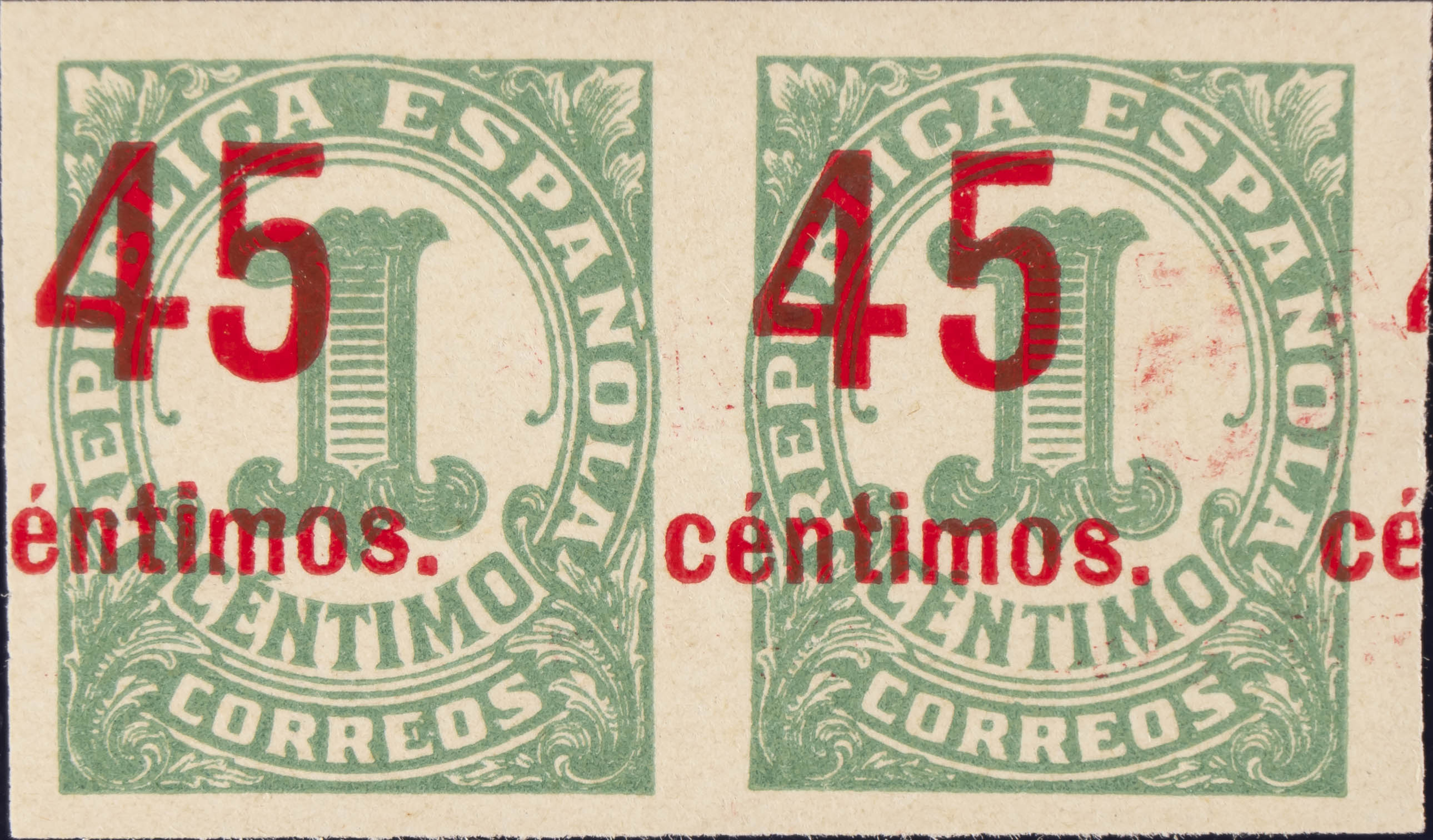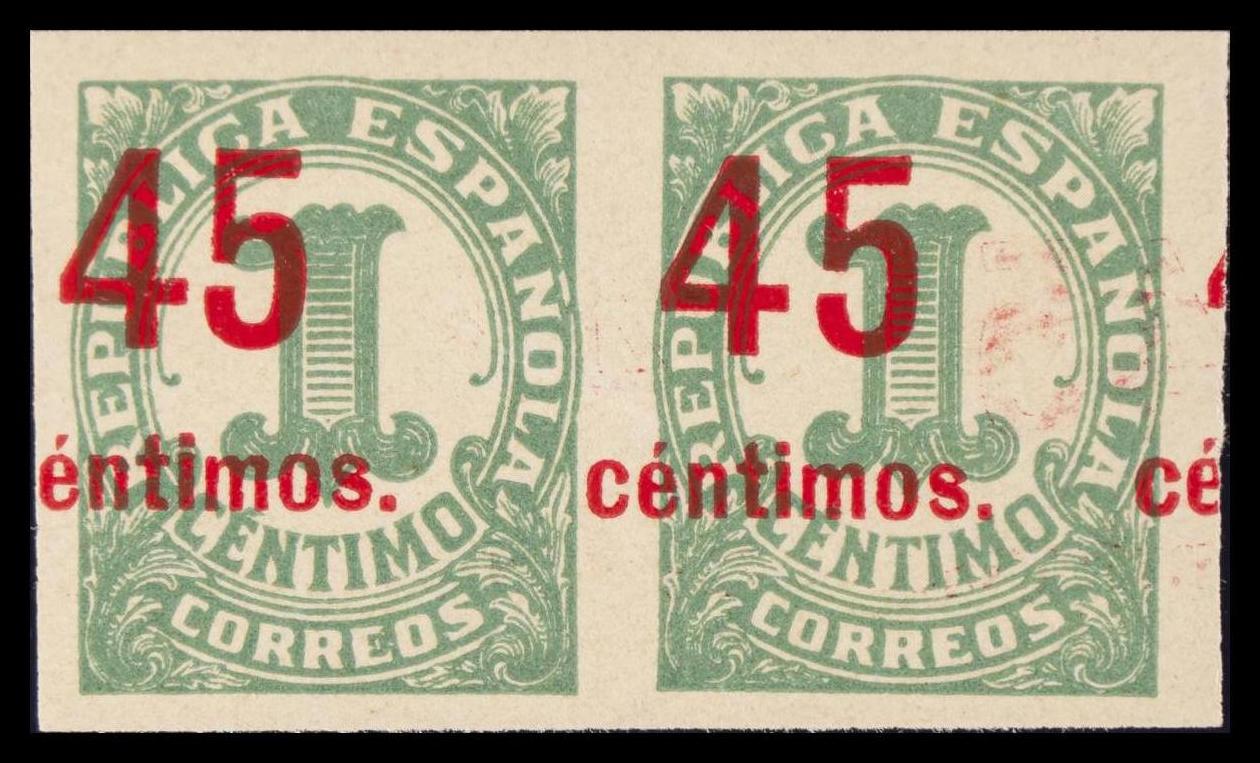 ★★ 742hz(2). 1938. 45 cts sobre 1 cts verde, pareja. SIN DENTAR y SOBRECARGA DESPLAZADA. MAGNIFICA. Edifil 2015: +80 Euros