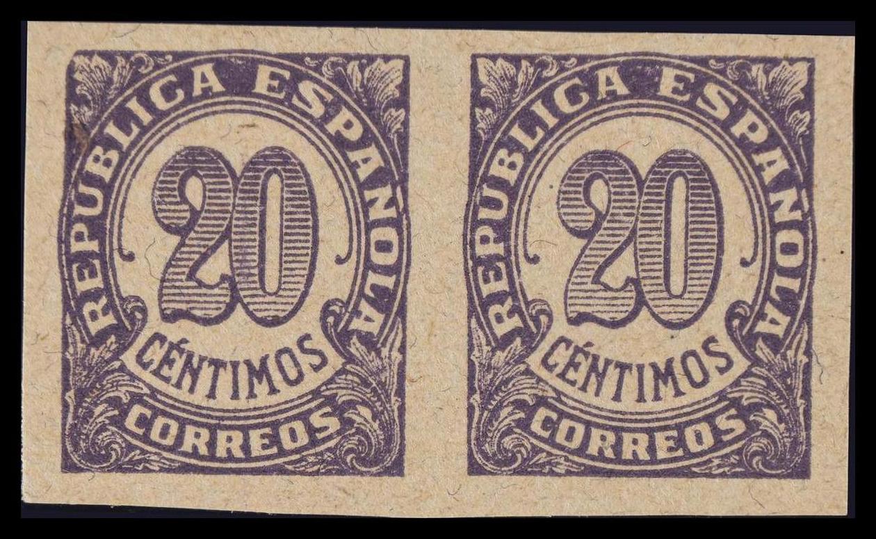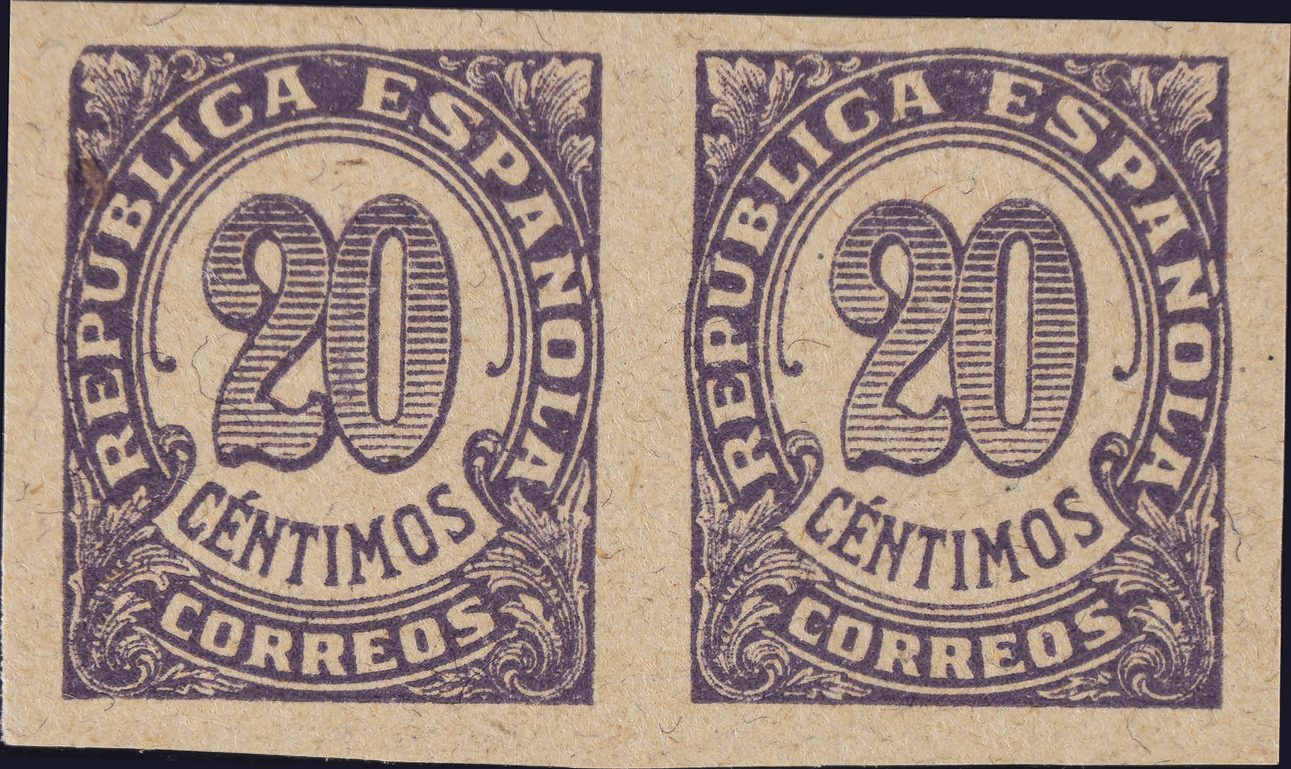 (★) 748sa(2). 1938. 20 cts violeta, pareja. PAPEL GRIS y SIN DENTAR. MAGNIFICA. Edifil 2020: +34 Euros