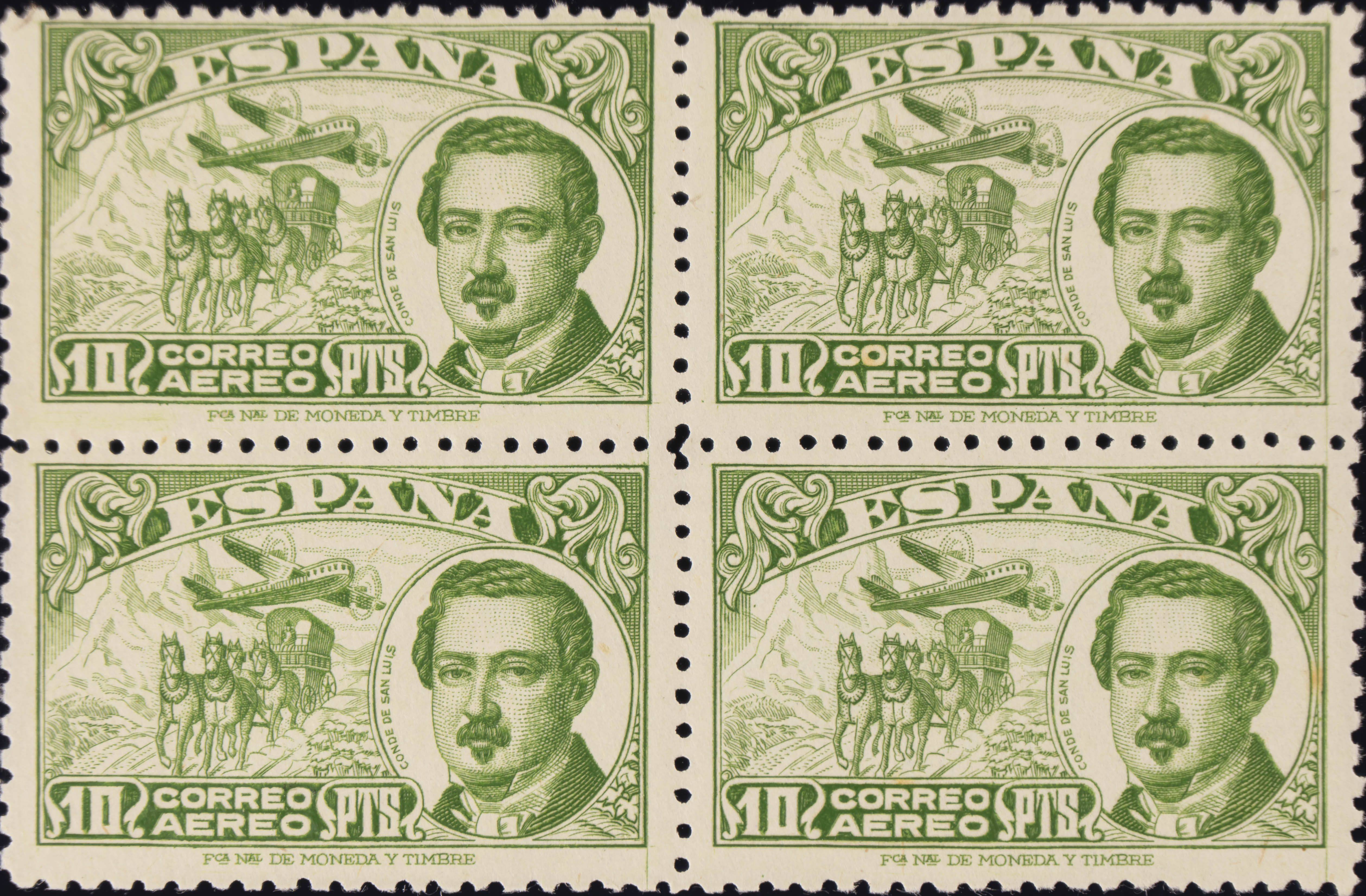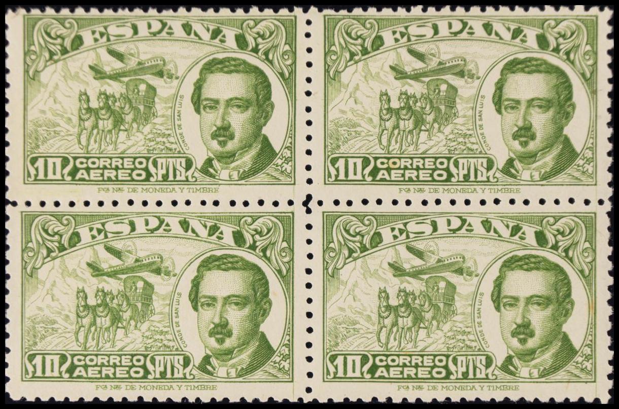 ★★ 990(4). 1945. 10 pts verde, bloque de cuatro. MAGNIFICO. Edifil 2020: +160 Euros
