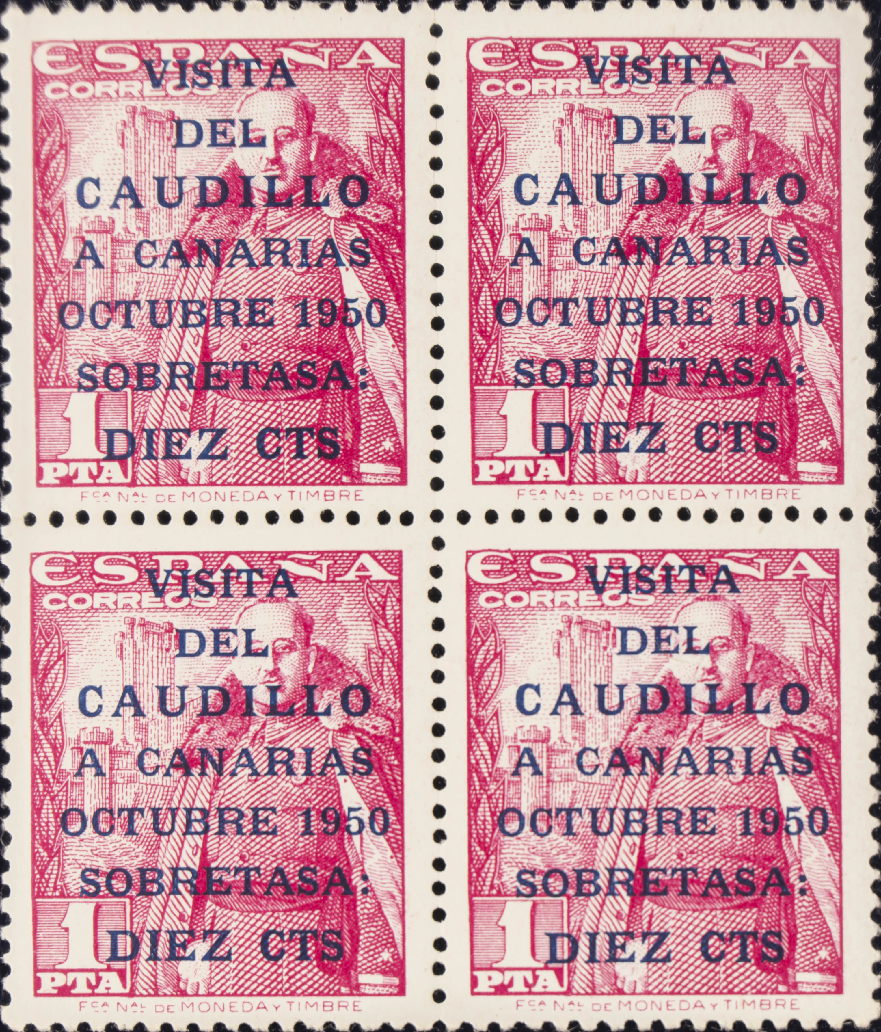 ★★ 1083B. 1950. +10 cts sobre 1 pts rosa, bloque de cuatro. 1ª TIRADA. MAGNIFICO. Edifil 2020: +800 Euros
