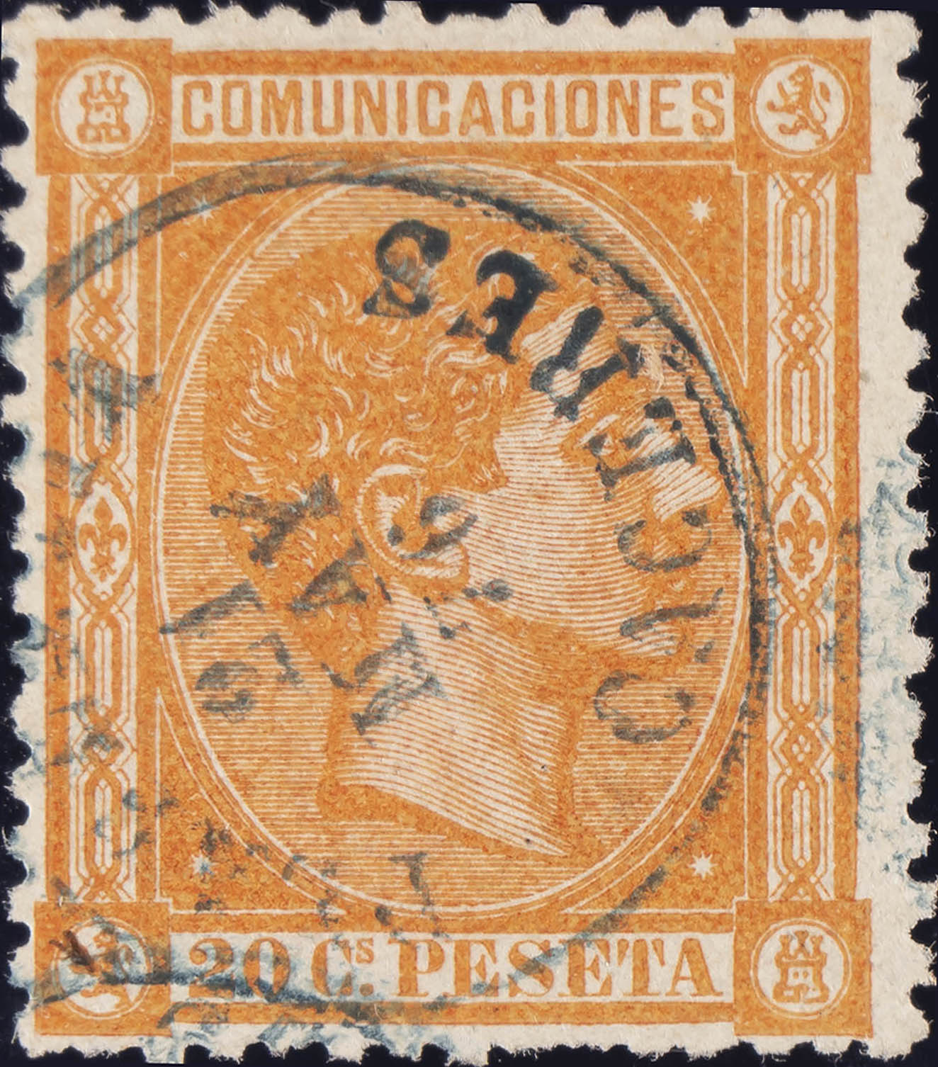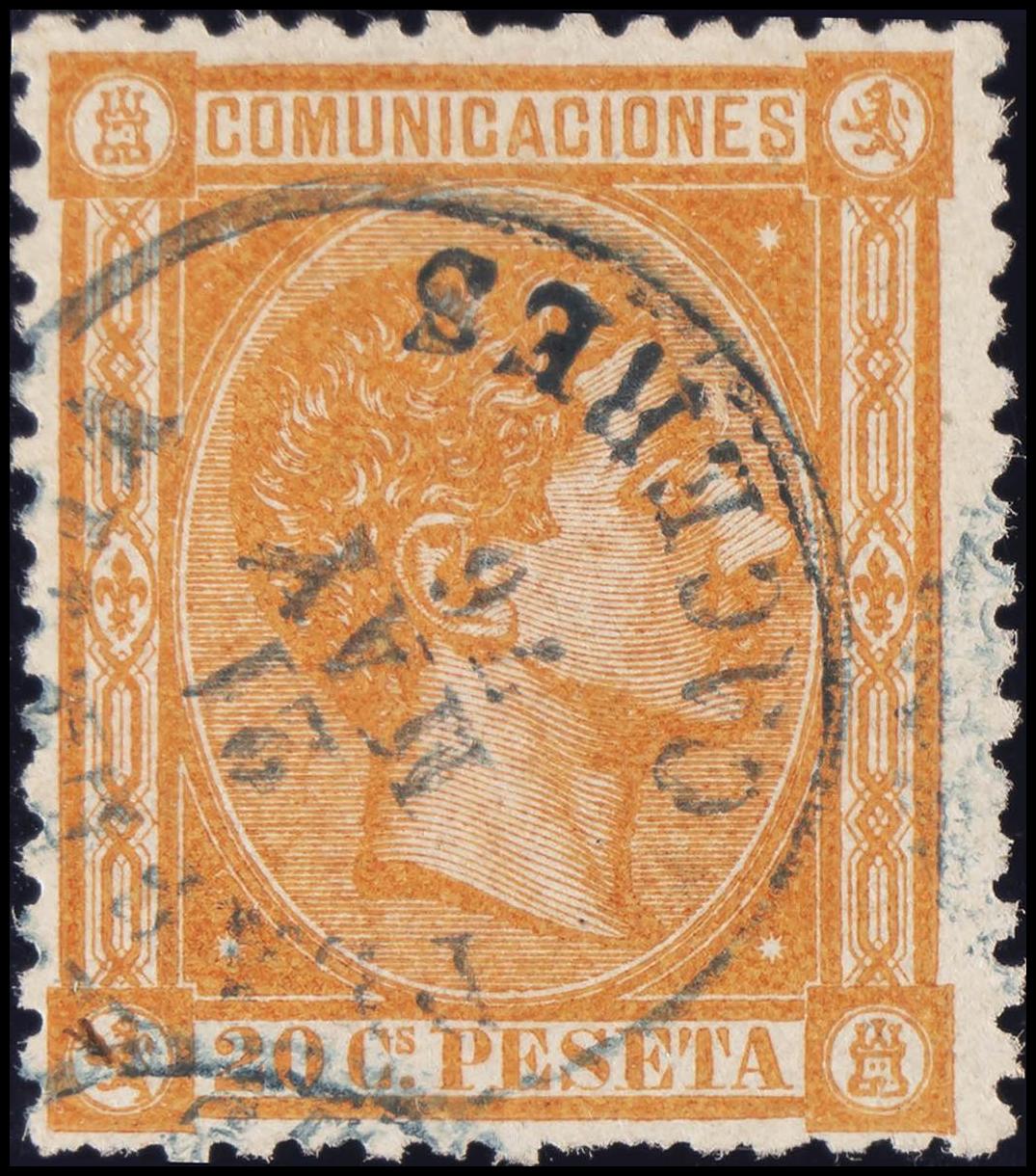 165. 1875. 20 cts naranja. Muy bien centrado (matasello PLASENCIA / CACERES, en azul). MAGNIFICO. Edifil 2020: +150 Euros