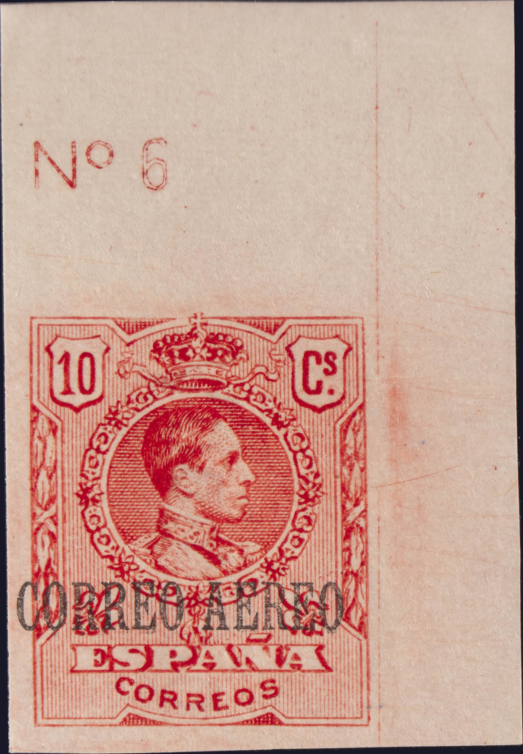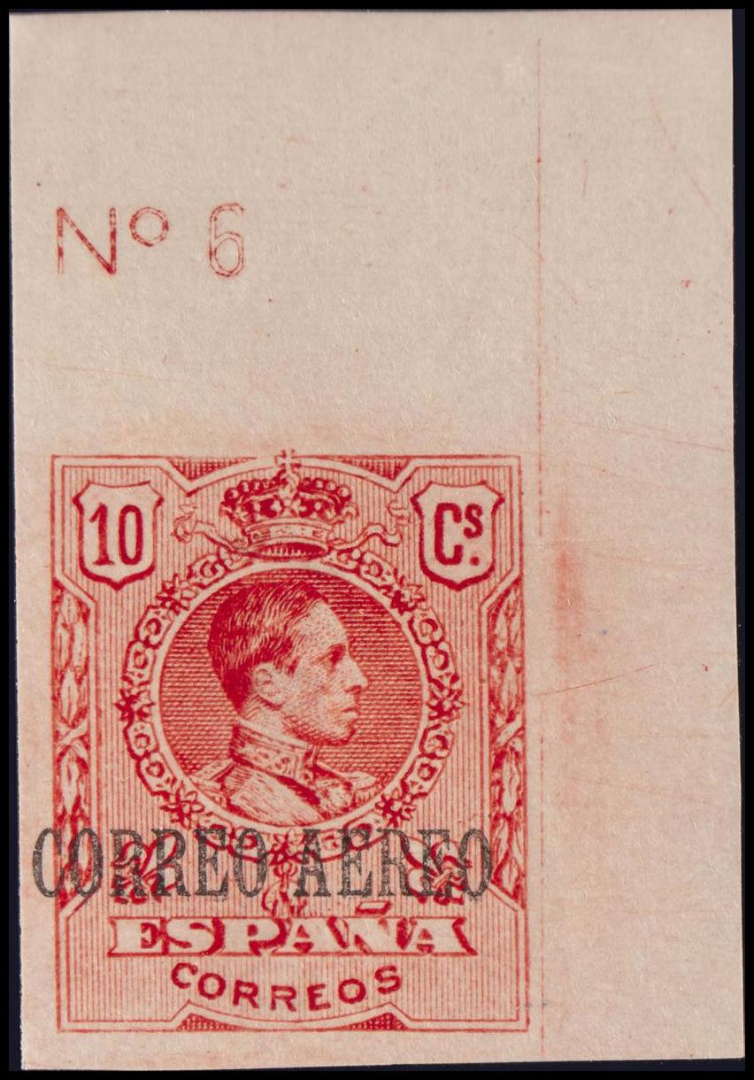 ★ 293s. 1920. 10 cts rojo, esquina de pliego con número. SIN DENTAR. MAGNIFICO. Edifil 2022: +104 Euros