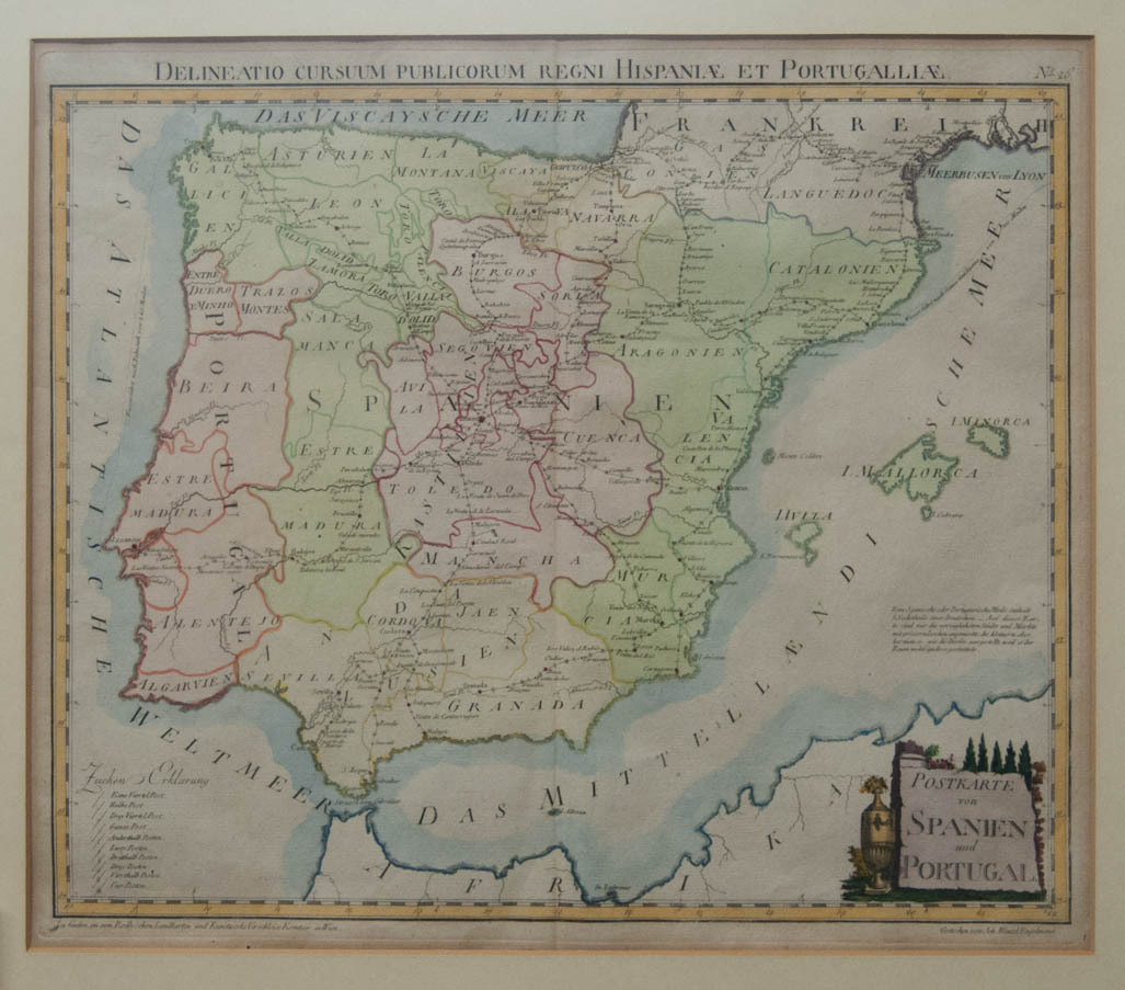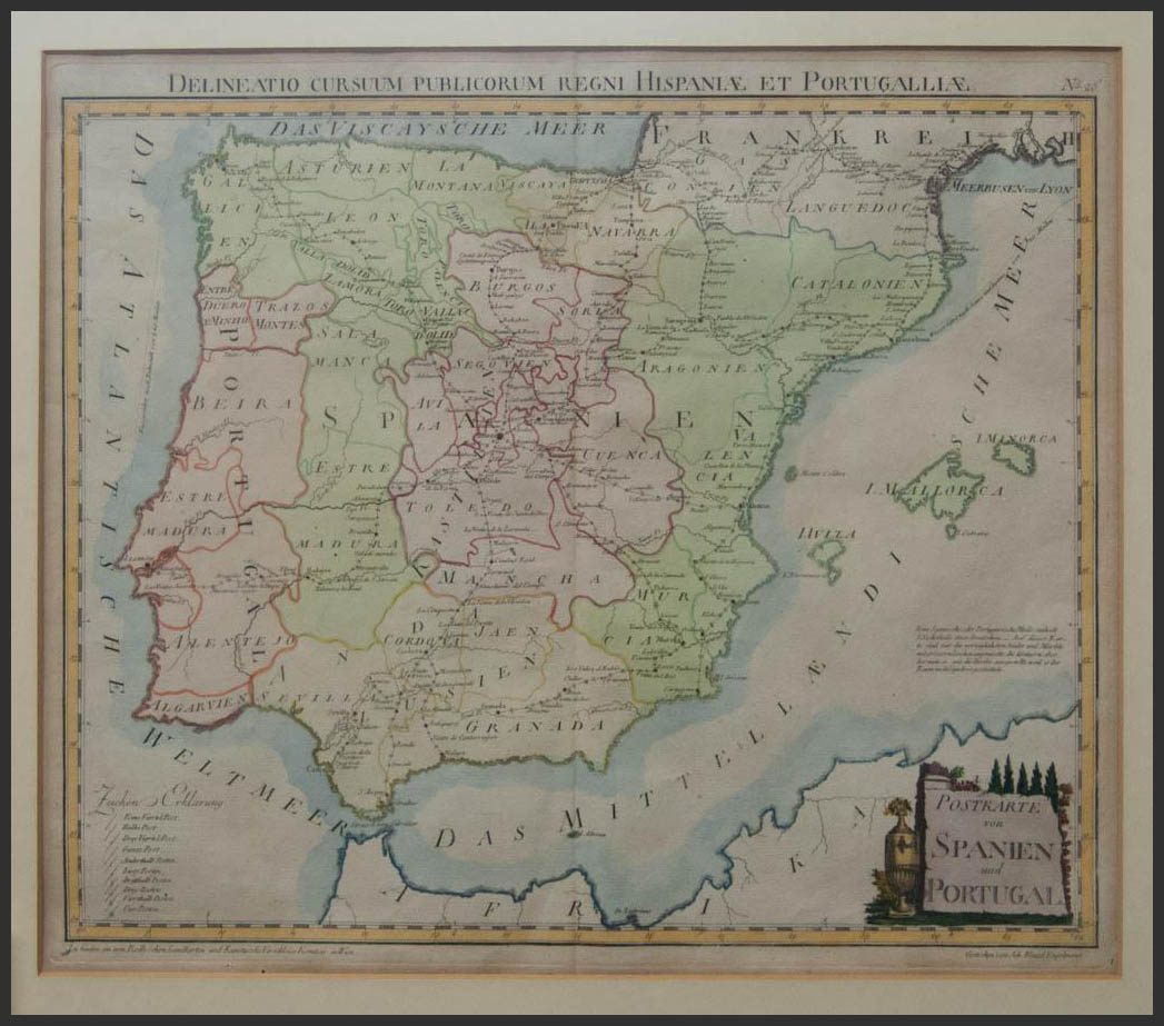 1799. Mapa de las Rutas Postales en la Península Ibérica POSTKARTE SPANIEN PORTUGAL (grabado coloreado). Viena, 1799. Franz Johann Joseph von Reilly. (medidas: 40 X 47 cm). MAGNIFICO Y RARISIMO.