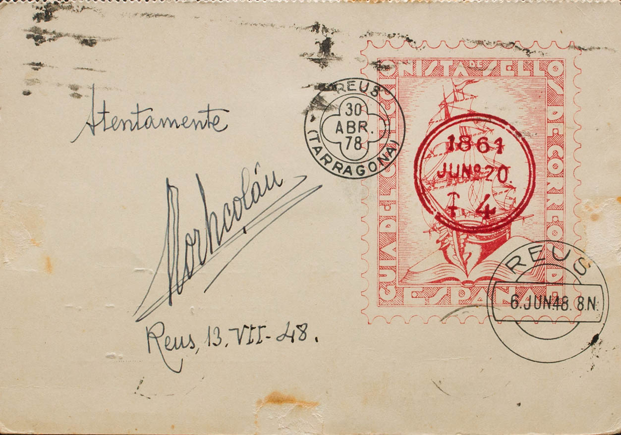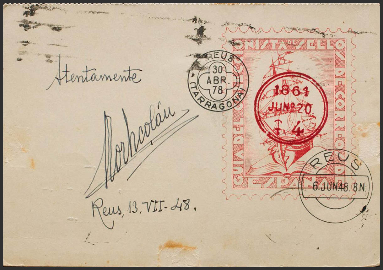 1035. 1948. 35 cts negro. Tarjeta Postal de la GUIA DEL COLECCIONISTA DE SELLOS DE CORREOS DE ESPAÑA (de Tort Nicolau) de REUS a BARCELONA. MAGNIFICO E INUSUAL ILUSTRADA CON LA PRIMERA PAGINA DE LA OBRA.