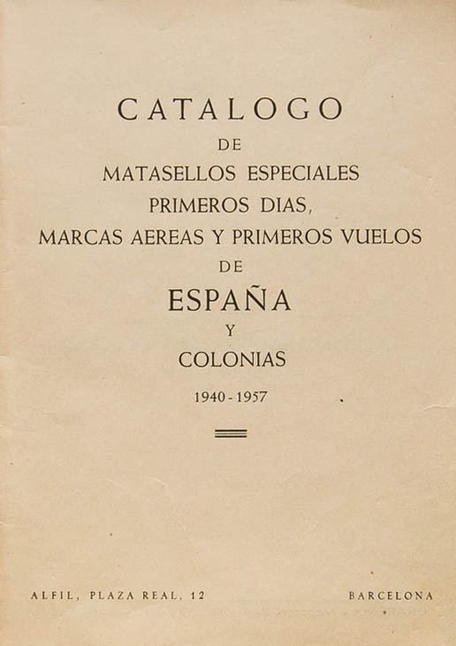 1958. PRIMER SUPLEMENTO DEL CATALOGO DE MATASELLOS ESPECIALES PRIMEROS DIAS, MARCAS AEREAS Y PRIMEROS VUELOS DE ESPAÑA, PROVINCIAS AFRICANAS Y EX-PROTECTORADO 1940-1958. Alert Riba. Barcelona, 1958.