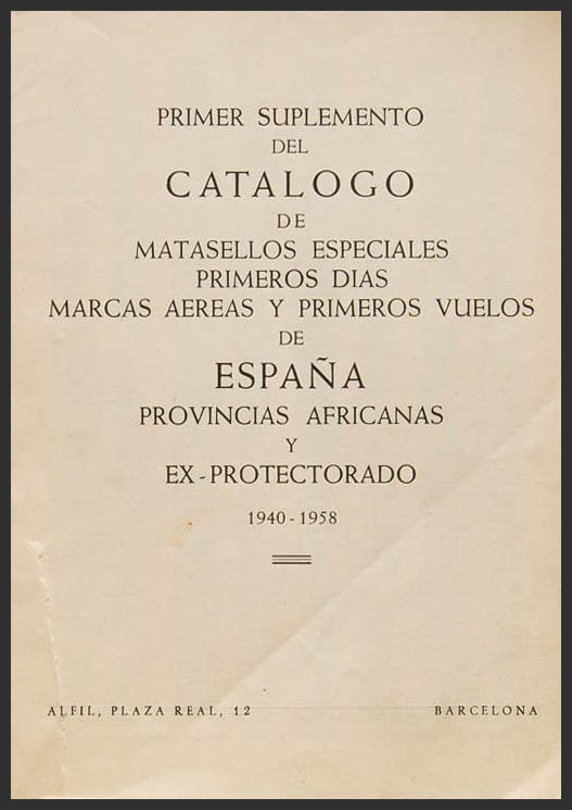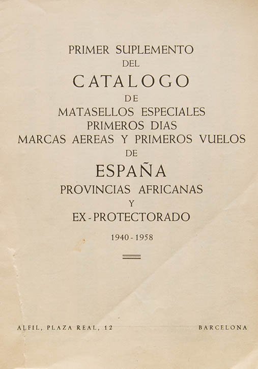 1958. PRIMER SUPLEMENTO DEL CATALOGO DE MATASELLOS ESPECIALES PRIMEROS DIAS, MARCAS AEREAS Y PRIMEROS VUELOS DE ESPAÑA, PROVINCIAS AFRICANAS Y EX-PROTECTORADO 1940-1958. Alert Riba. Barcelona, 1958.