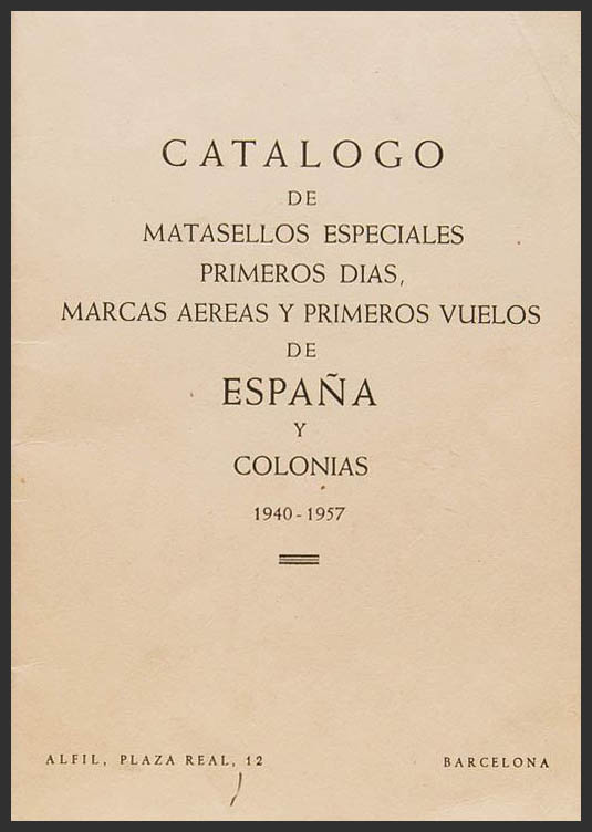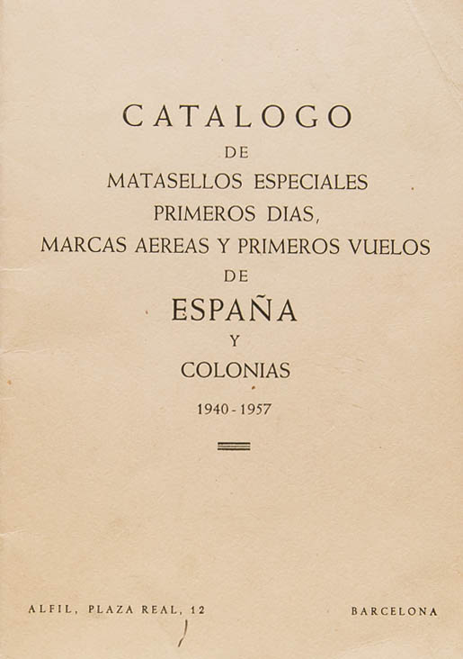 1958. PRIMER SUPLEMENTO DEL CATALOGO DE MATASELLOS ESPECIALES PRIMEROS DIAS, MARCAS AEREAS Y PRIMEROS VUELOS DE ESPAÑA, PROVINCIAS AFRICANAS Y EX-PROTECTORADO 1940-1958. Alert Riba. Barcelona, 1958.