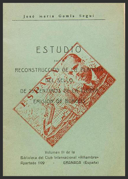 1959. ESTUDIO PARA LA RECONSTRUCCION DE LA PLANCHA DEL SELLO DE 25 CENTIMOS DE LA CIERVA EMISION BURGOS. José María Gomis Seguí. Volumen III de la Biblioteca Internacional "Alhambra". Granada, 1959.