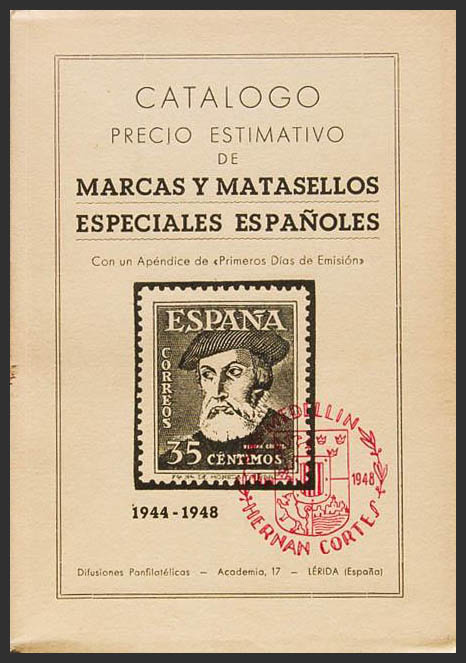 1948. CATALOGO PRECIO ESTIMATIVO DE MARCAS Y MATASELLOS ESPECIALES ESPAÑOLES 1944-1948. Lérida, 1948. (nuevo, rarísimo especialmente así)