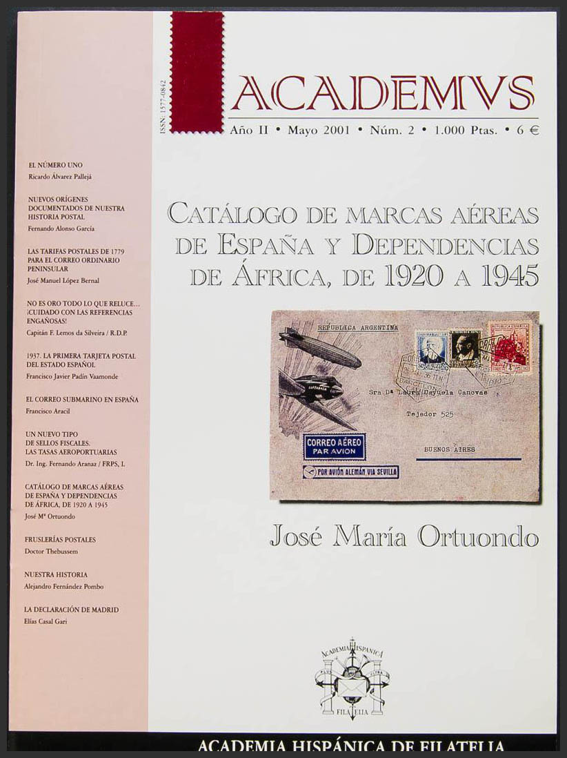 2001. Revista ACADEMUS Nº2. CATALOGO DE MARCAS AEREAS DE ESPAÑA Y DEPENDENCIAS DE AFRICA DE 1920 A 1945, José María Ortuondo. Academia Hispánica de Filatelia. Madrid, 2000.