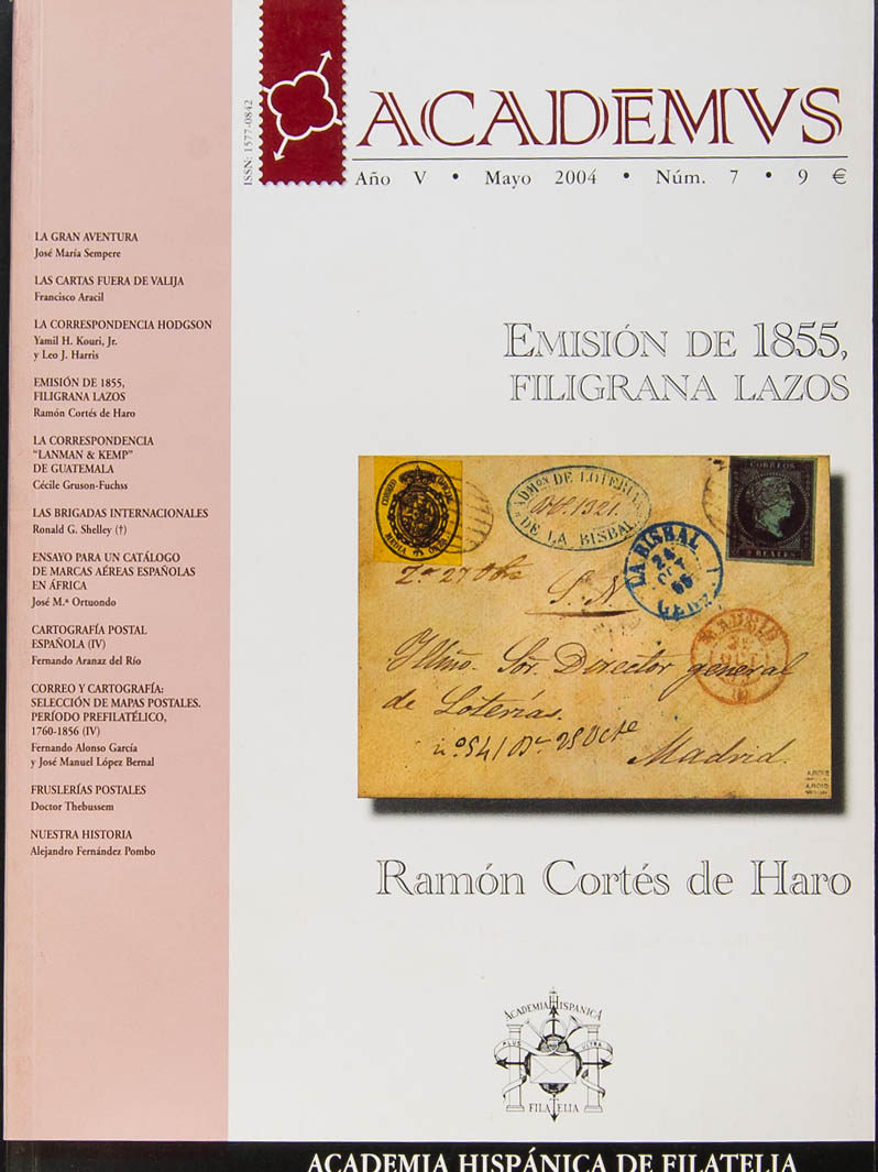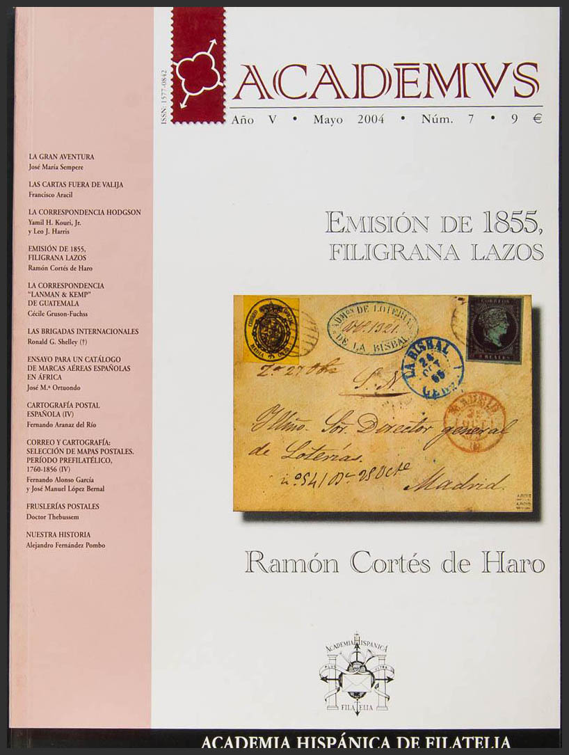 2004. Revista ACADEMUS Nº7. EMISION DE 1855 FILIGRANA LAZOS, Ramón Cortés de Haro. Academia Hispánica de Filatelia. Madrid, 2004.