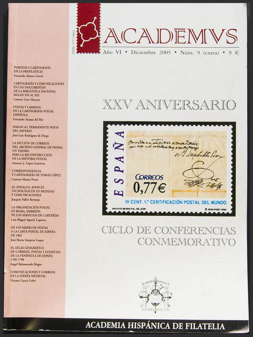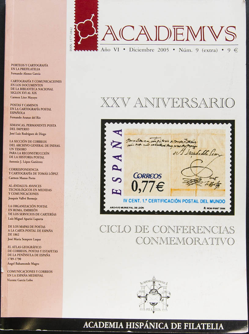 2005. Revista ACADEMUS Nº9. XXV ANIVERSARIO CICLO DE CONFERENCIAS CONMEMORATIVO. Academia Hispánica de Filatelia. Madrid, 2004.