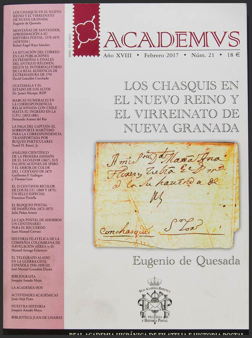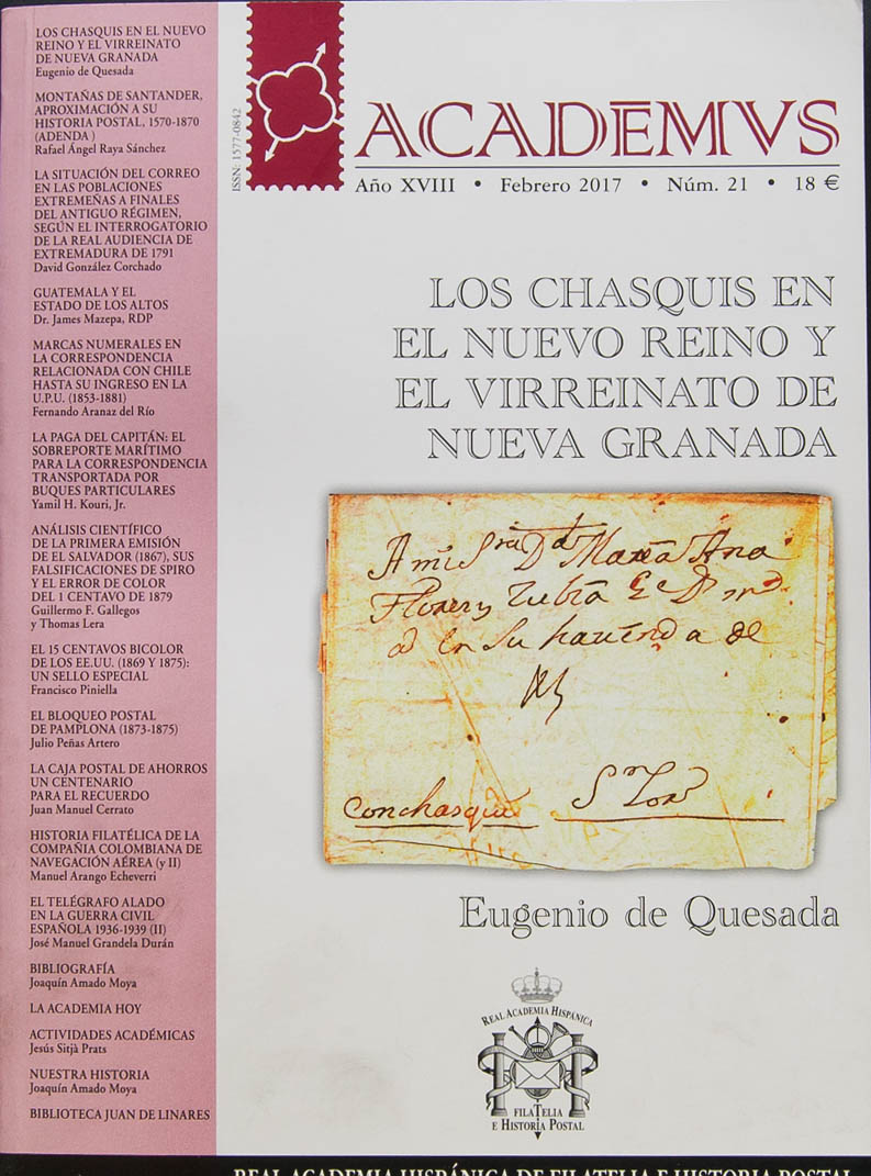 2017. Revista ACADEMUS Nº21. LOS CHASQUIS EN EL NUEVO REINO Y EL VIRREINATO DE NUEVA GRANADA, Eugenio de Quesada. Real Academia Hispánica de Filatelia e Historia Postal. Madrid, 2017.
