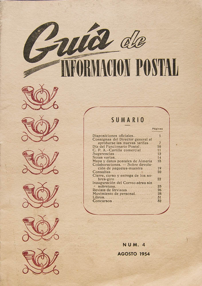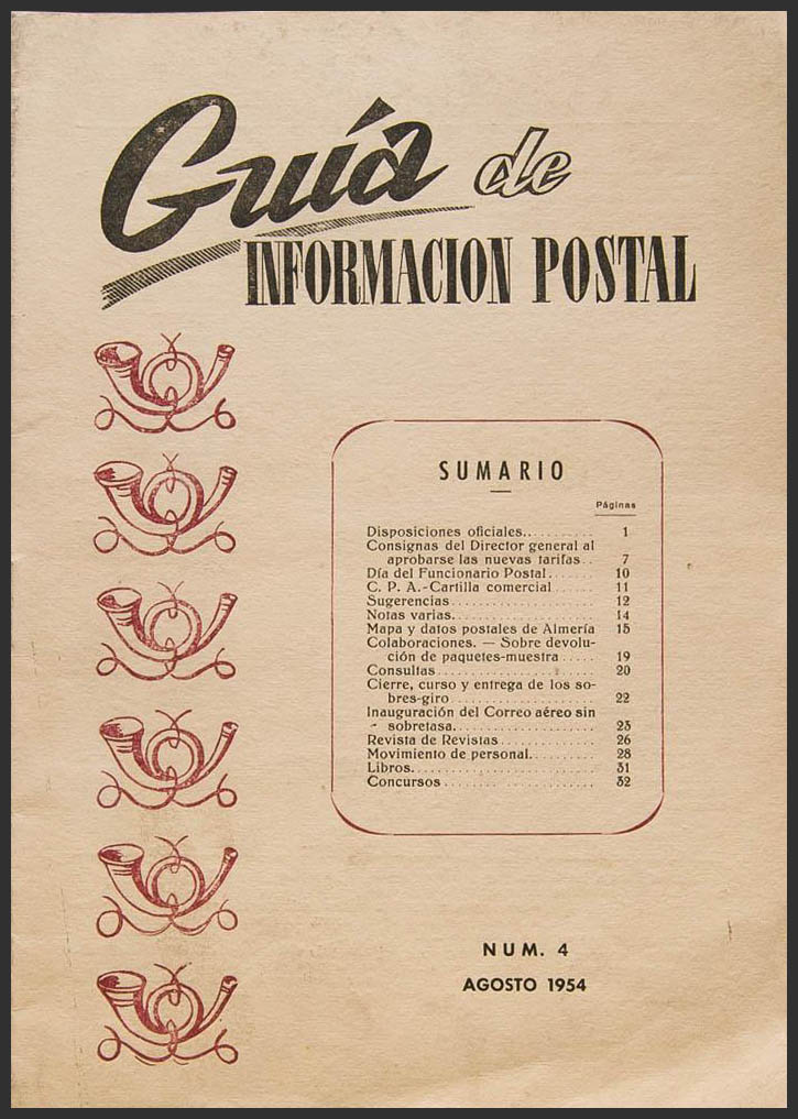 (1954ca). Conjunto de catorce revistas GUIA DE INFORMACION POSTAL editadas entre Agosto de 1954 y Mayo de 1957 y correspondientes a los números 4, 7, 8, 10, 11, 12, 13, 14, 15, 16, 19, 20, 21 y 37. Madrid, 1954-57.