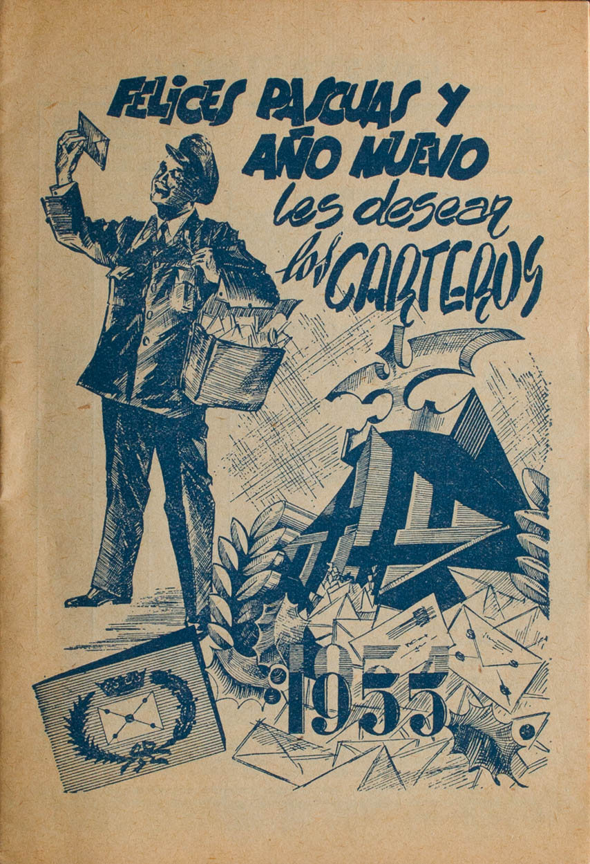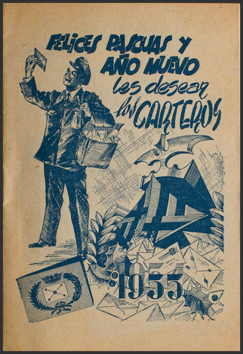1955. Felicitación del Cartero del año 1955, en la ciudad de Barcelona y con datos de interés del Servicio de Correos (básicamente tarifas de la época). Barcelona, 1955.