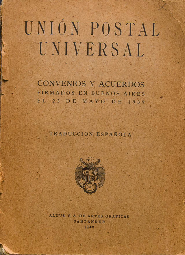 1942. LA UNION POSTAL UNIVERSAL, CONVENIOS Y ACUERDOS FIRMADOS EN BUENOS AIRES EL 23 DE MAYO DE 1939. Ediciones, Aldu. Santander, 1942. Volumen fatigado y la cubierta, aunque completa, la primera hoja separada. Monumental obra germen de la modernización mundial del sistema de correos, se incluyen una enorme cantidad de impresos estandarizados a nivel mundial que incluso hoy en dÃa siguen utilizándose.