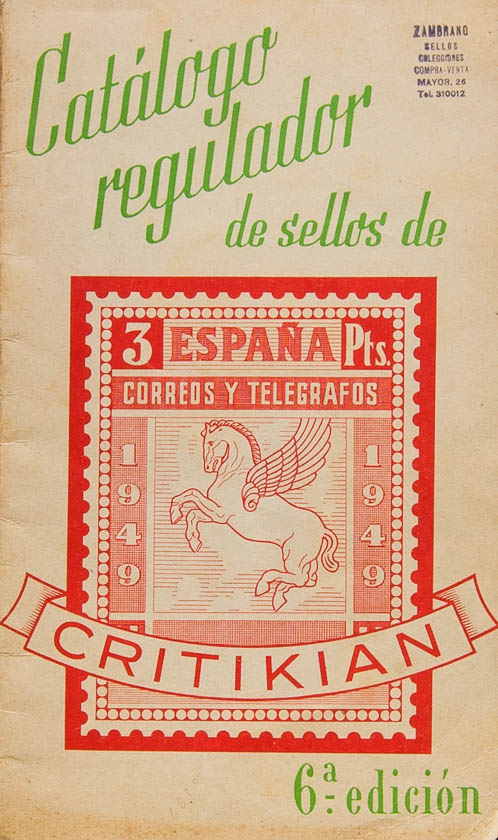 1949. CATALOGO REGULADOR DE SELLOS DE ESPAÑA CRITIKIAN. 6ª Edición. Editorial Dossat. Madrid, 1949.