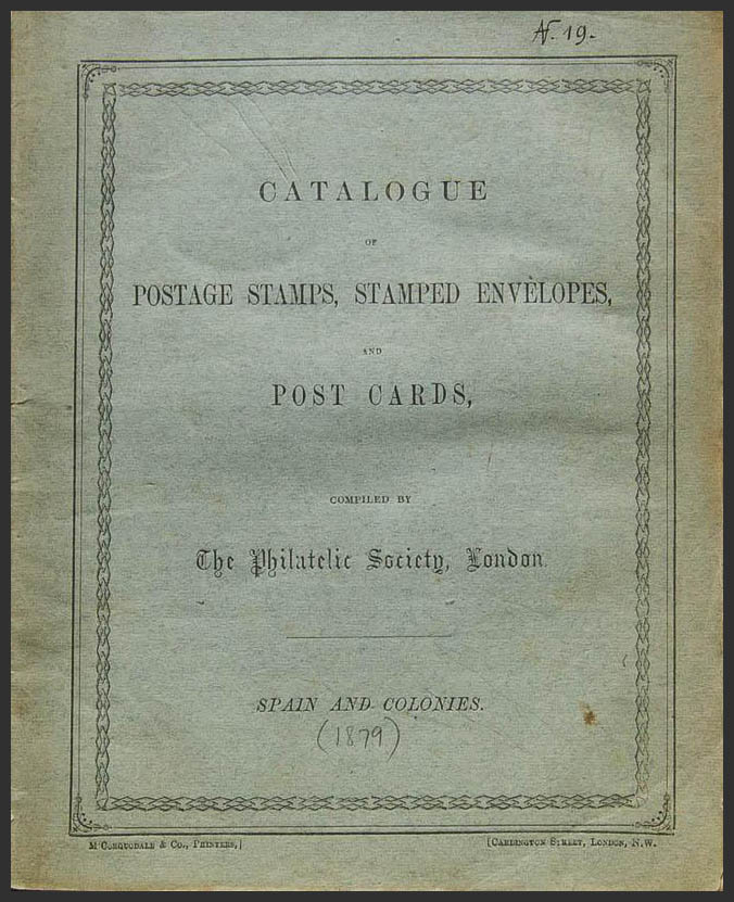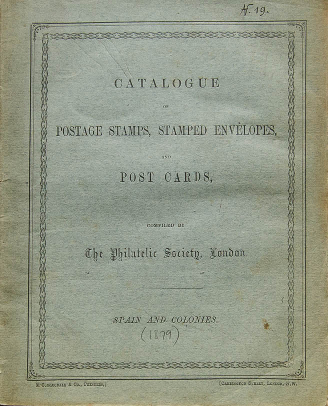 1878. CATALOGUE OF POSTAGE STAMPS, STAMPED ENVELOPES AND POSTCARDS OF SPAIN AND COLONIES. Editado por The Philatelic Society. Londres, 1878. MAGNIFICO Y EXTREMADAMENTE RARO, SEGUN EL BIBLIOGRAFO FILATELICO NATHAN SE TRATA DEL PRIMER CATALOGO DE SELLOS DE ESPAÑA, Y LA PRIMERA OBRA IMPRESA DE LA ROYAL PHILATELIC SOCIETY.