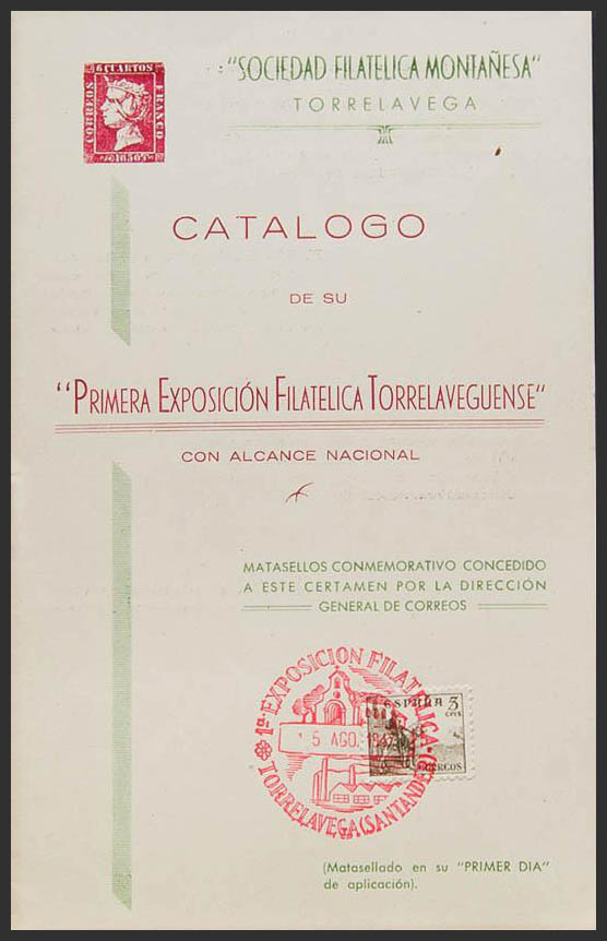 1947. Catálogo de la "PRIMERA EXPOSICION FILATELICA TORRELAVEGUENSE", celebrada del 15 al 25 de Agosto de 1947. Organiza Sociedad Filatélica Montañesa. Torrelavega, 1947.