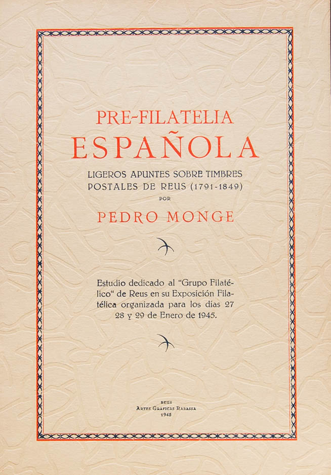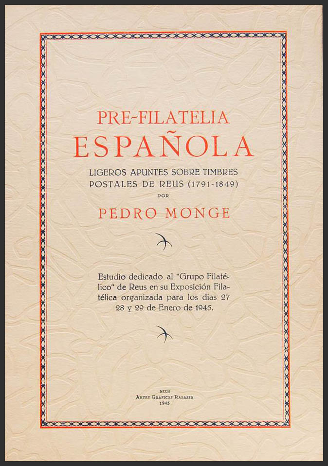 1945. PRE-FILATELIA ESPAÑOLA BREVE RESEÑA DE TIMBRES POSTALES DE REUS (1764-1849). Pedro Monge. Reus, 1945.