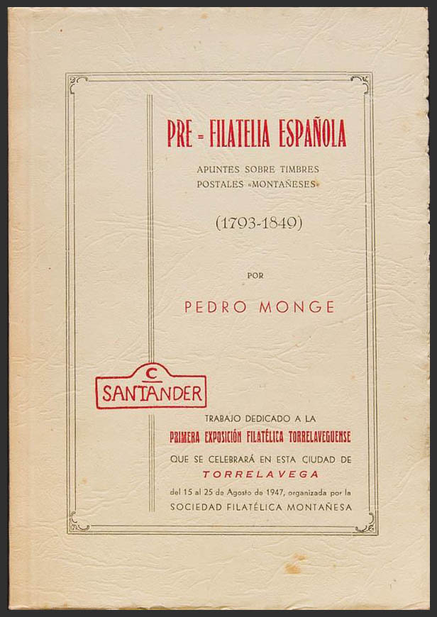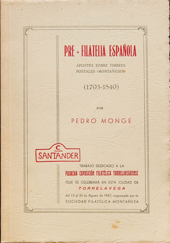 1947. PRE-FILATELIA ESPAÑOLA, APUNTES SOBRE TIMBRES POSTALES MONTAÑESES. (1793-1849). Pedro Monge. Trabajo dedicado a la 1ª Exposición Filatélica Torrelaveguense. Santander, 1947. (edición especial con papel elegante)