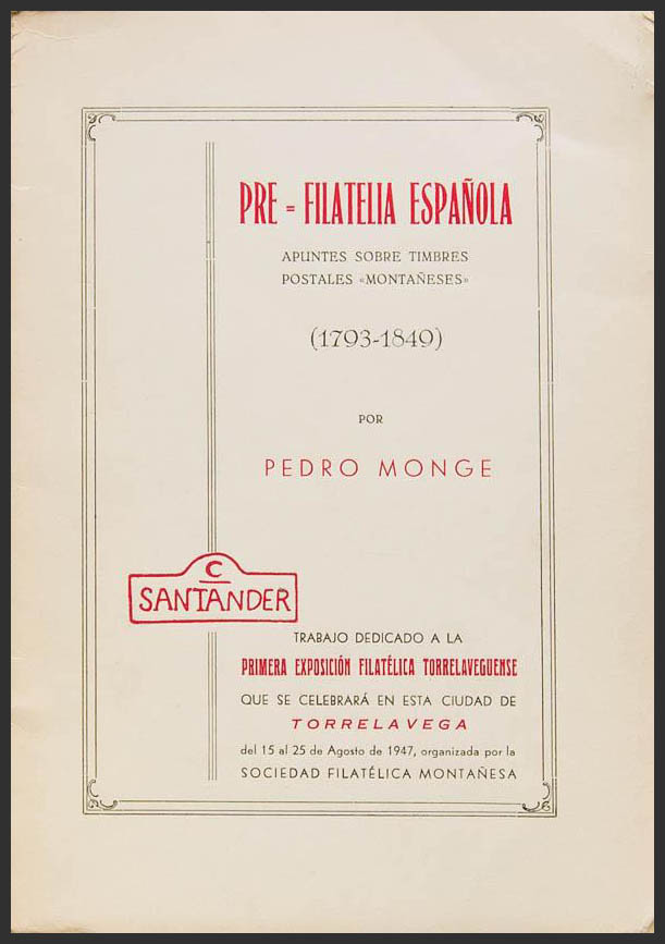 1947. PRE-FILATELIA ESPAÑOLA, APUNTES SOBRE TIMBRES POSTALES MONTAÑESES. (1793-1849). Pedro Monge. Trabajo dedicado a la 1ª Exposición Filatélica Torrelaveguense. Santander, 1947.