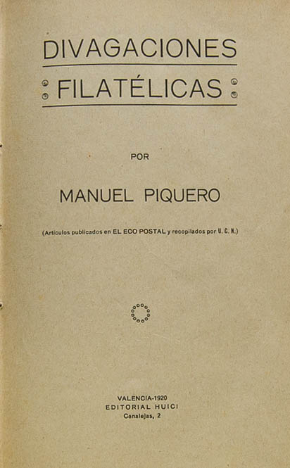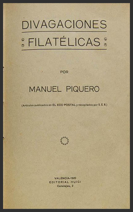 1920. DIVAGACIONES FILATELICAS. Manuel Piquero. Edita Huici. Valencia, 1920. (preciosamente encuadernado, años sesenta)