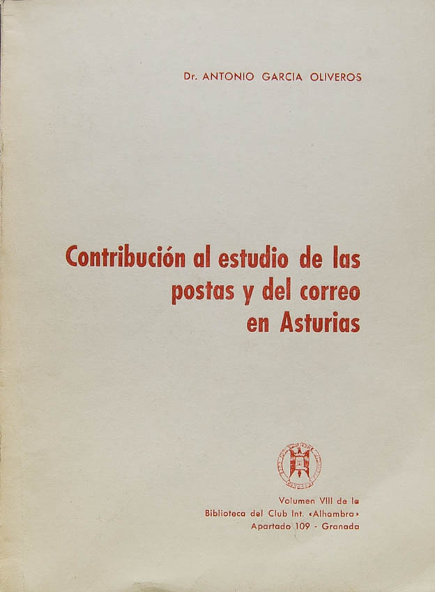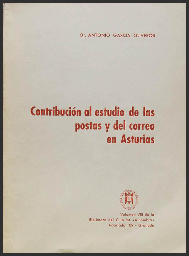 1971. CONTRIBUCION AL ESTUDIO DE LAS POSTAS Y DEL CORREO EN ASTURIAS. Antonio García Oliveros. Volumen VIII de la Biblioteca del Club Internacional "Alhambra". Granada, 1971. (interesantísima información postal)